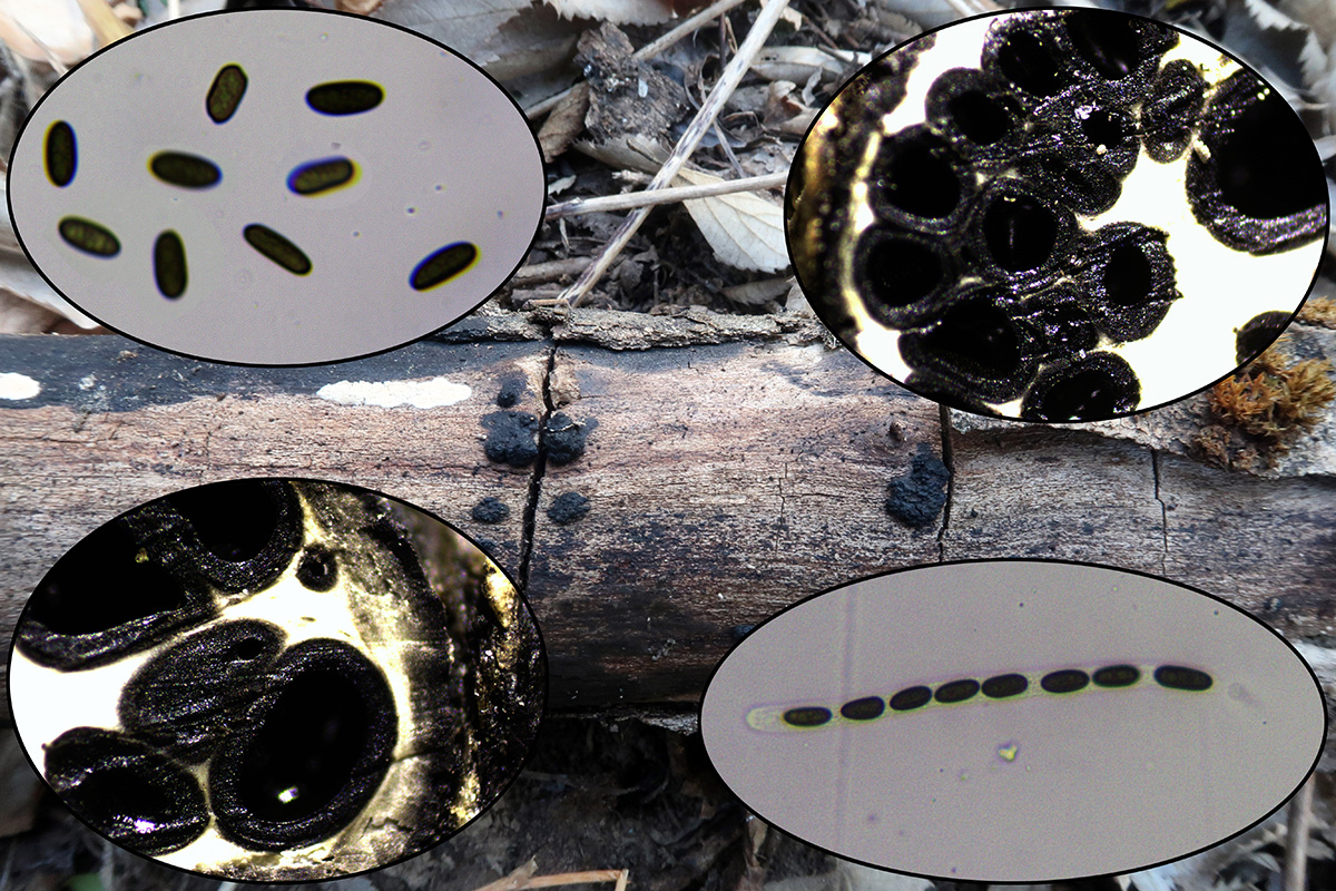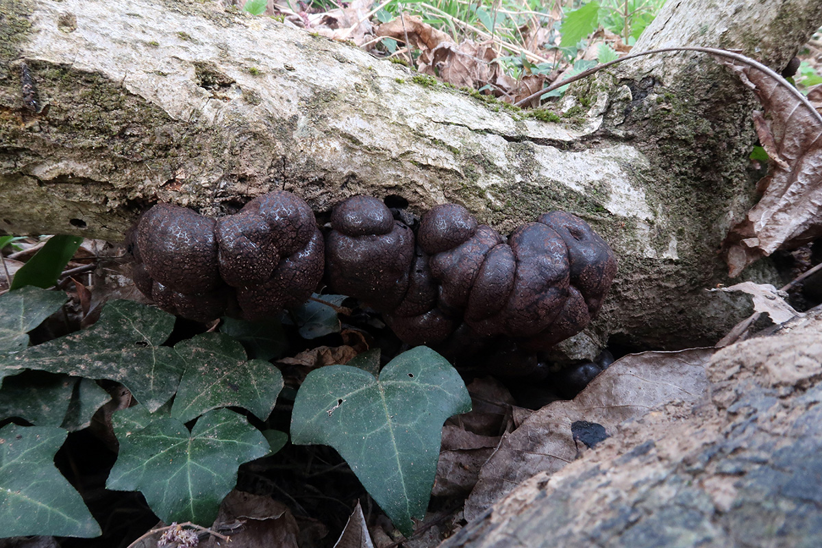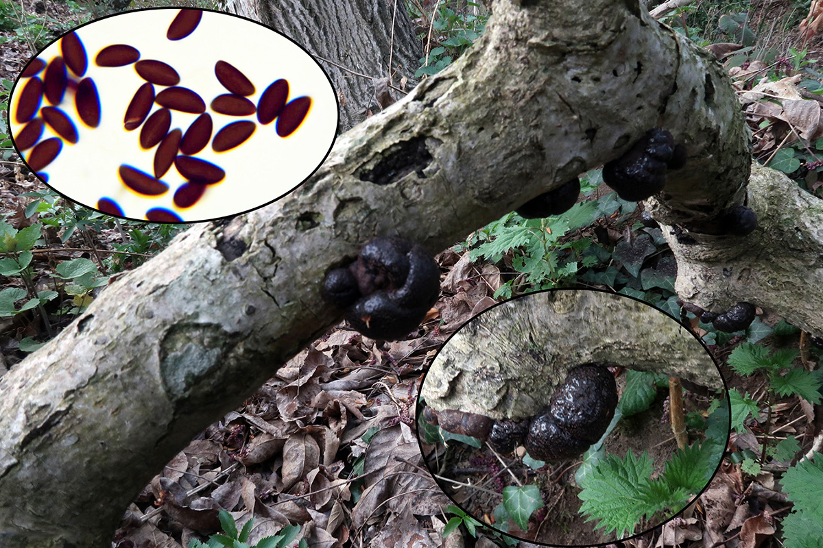 Unas imágenes de un tronco completamente cubierto por Daldinia concentrica