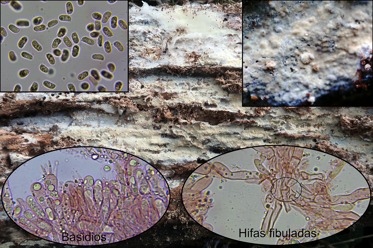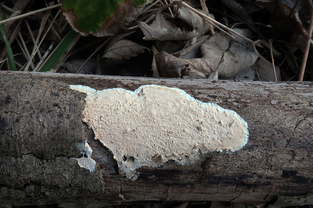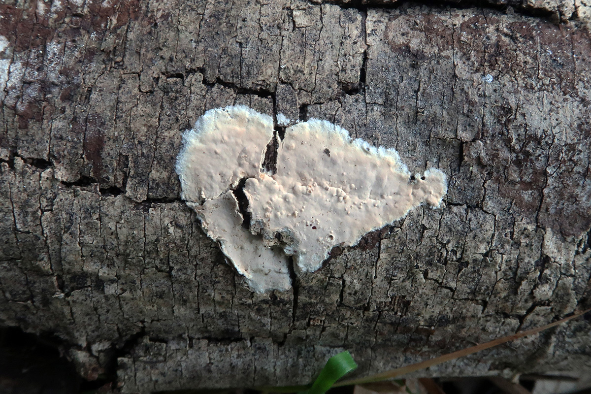 Fructificación resupinada, de color blanquecino, algo cremoso y con borde de crecimiento blanco.