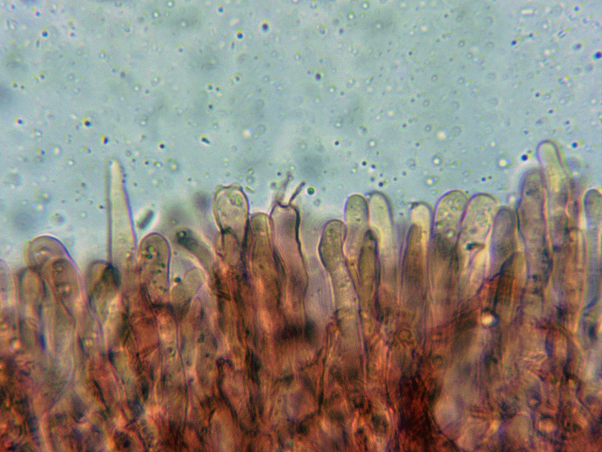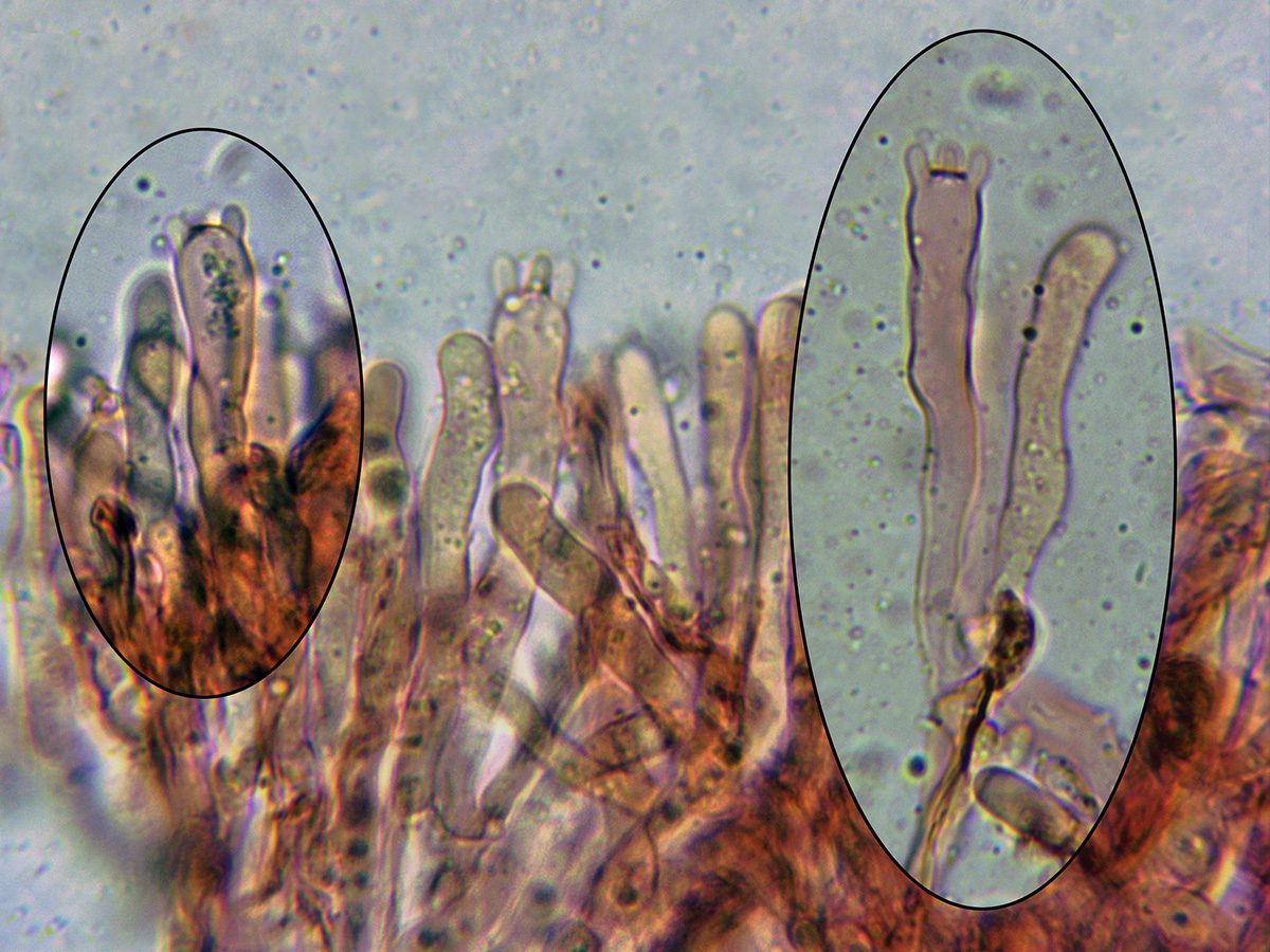 Himenio a 1000 aumentos, con basidios, basidiolos y cistidios.