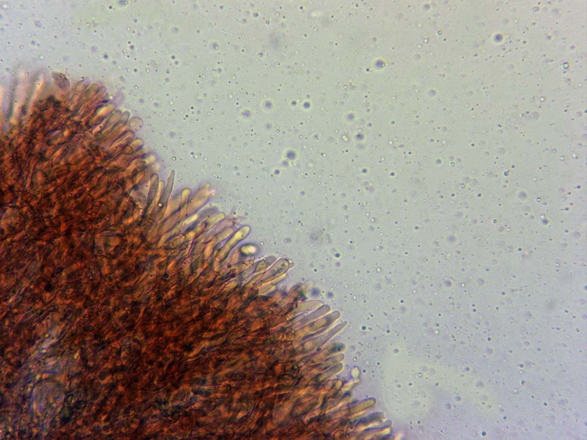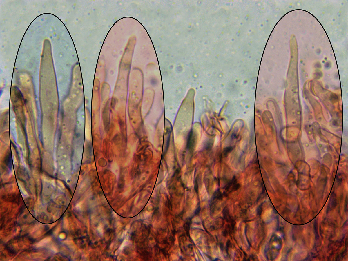 Cistidios fusiformes, hialinos y sobresaliendo algo por encima de los basidios.