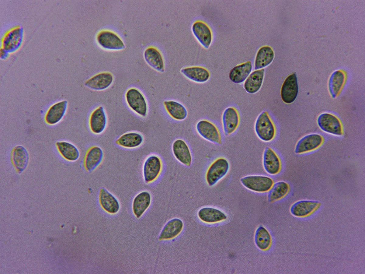 Sus esporas, alargadas, elipsoides, con discreta apícula lateral y contenido granuloso en su interior, las medidas de estas de: