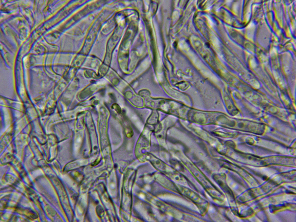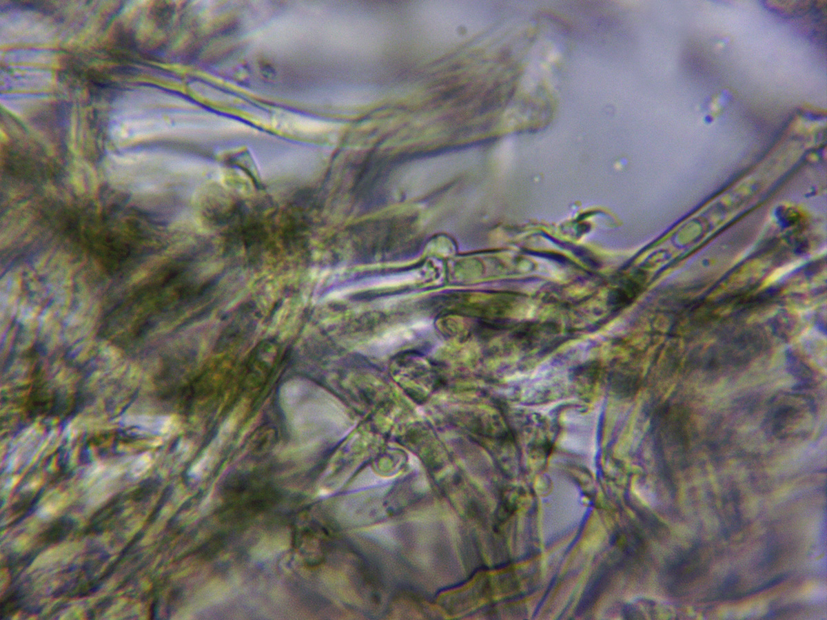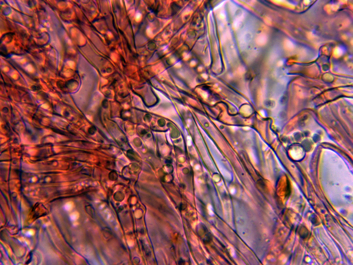 Estas hifas en rojo congo diluido muestran un contenido oleoso en su interior, todas provistas de marcadas fíbulas. Sistema hifal monomítico.