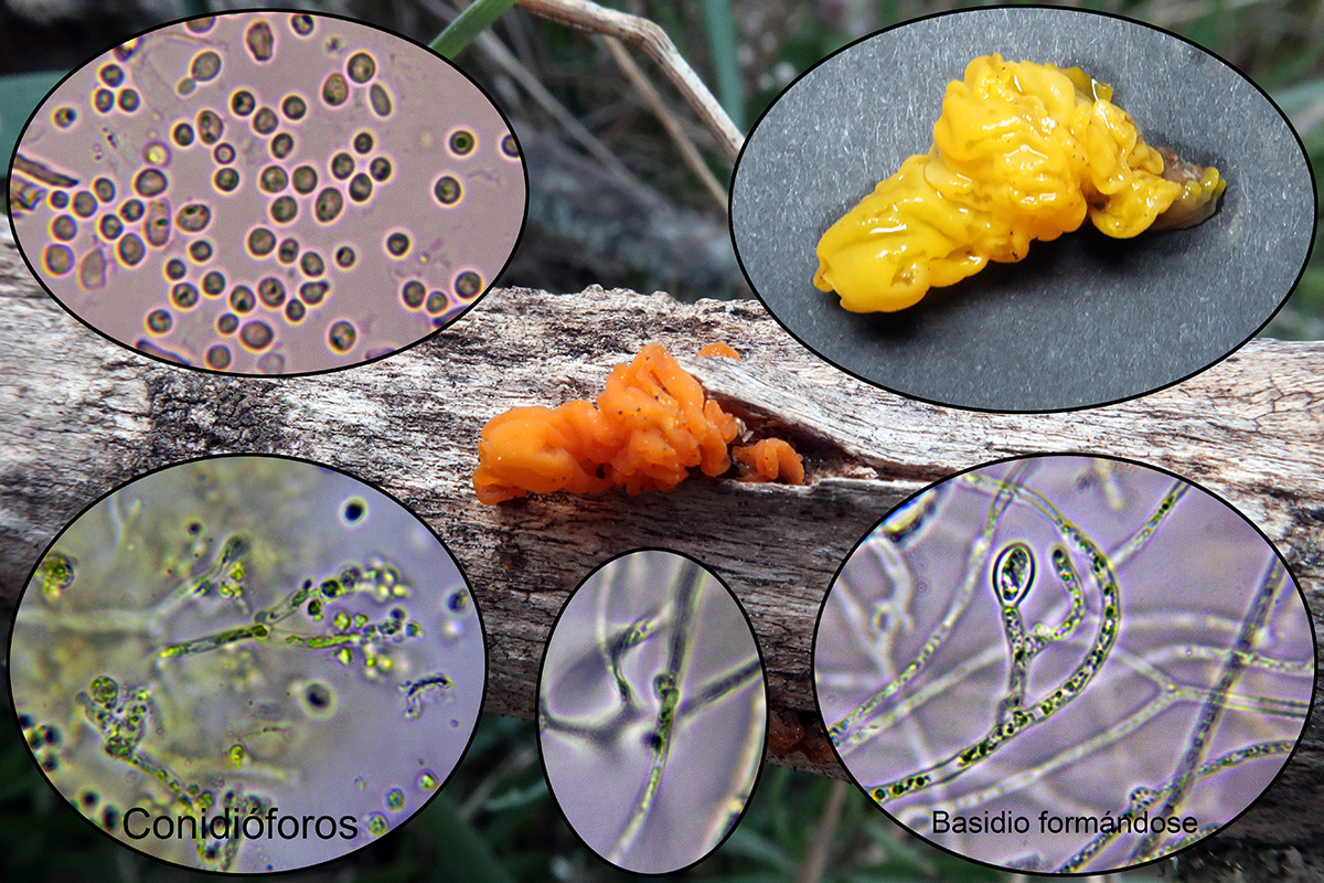Hay que ver lo que cambia con tan solo hidratarla (miniatura superior derecha), en la parte de abajo los conidióforos o hifas conidiógenas, sus hifas gelatinizadas y fibuladas y ya la incipiente formación de sus basidios.
