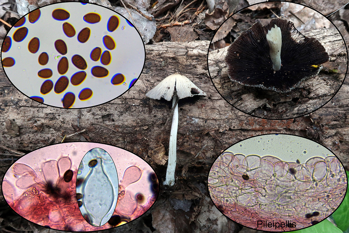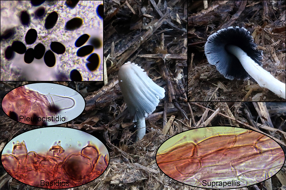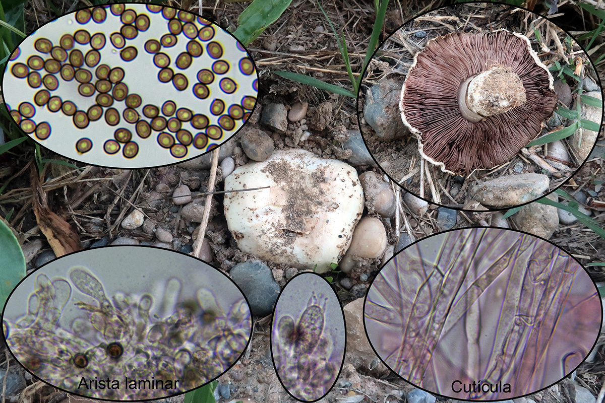 Con una típica depresión en el centro del sombrero, pié corto, hifas de la cutícula sin fíbulas y esporas en esta nueva medición con un tamaño de: