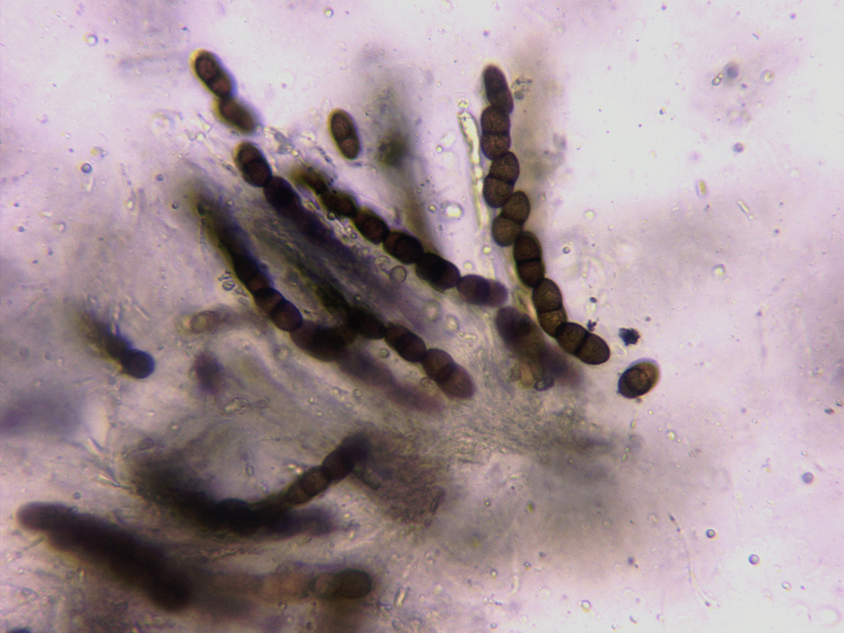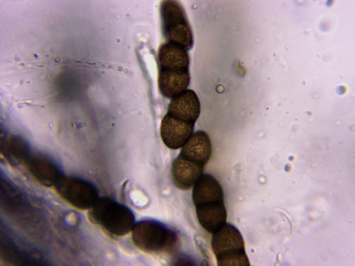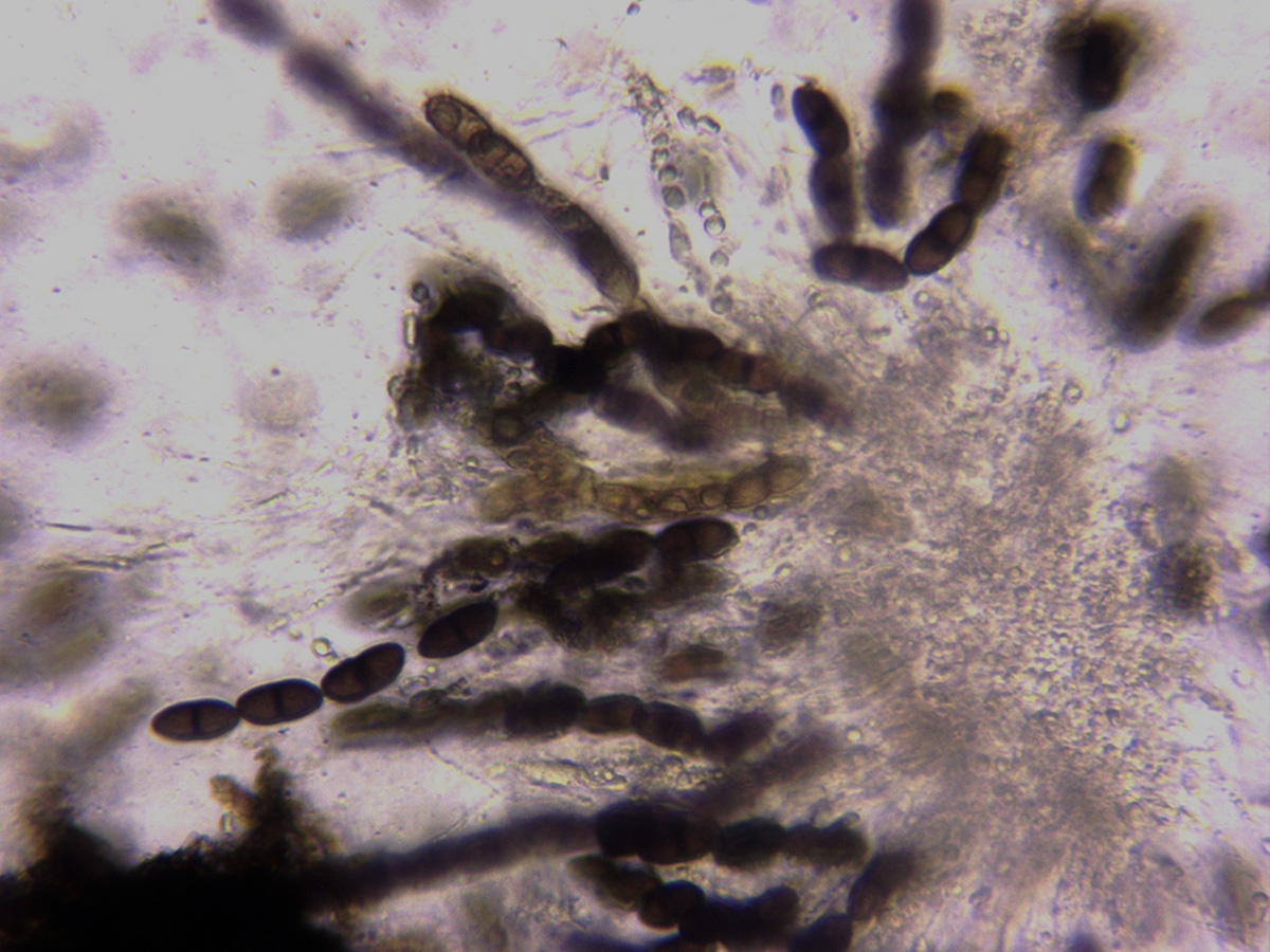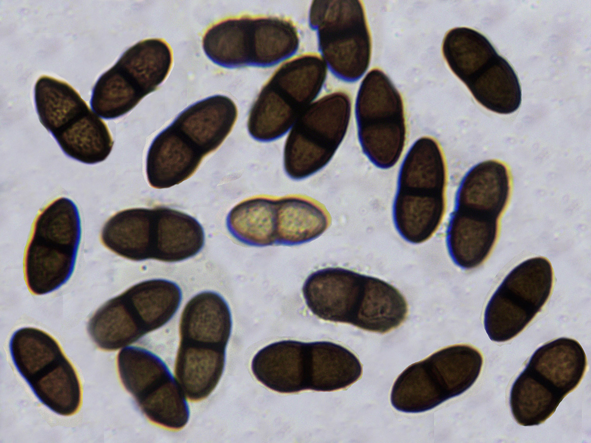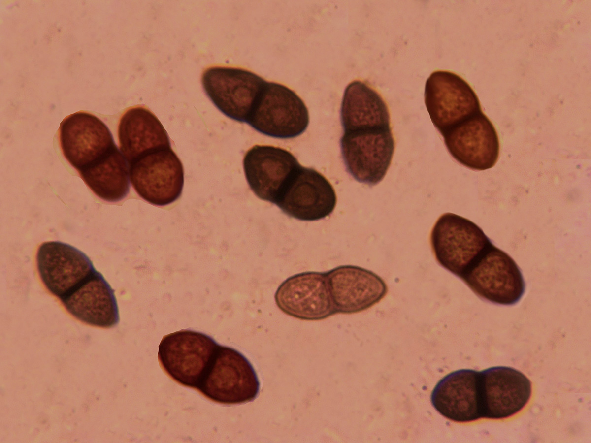 Con esporas de morfología variable y de considerable tamaño, sus medidas: