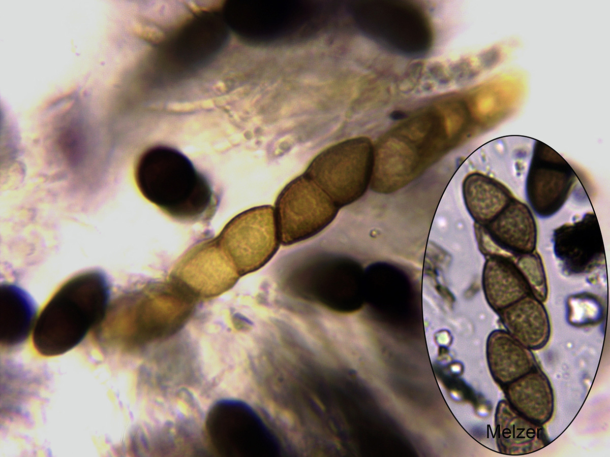 Ascas inmaduras con sus esporas, la de la imágen principal en KOH y la miniatura en Melzer.