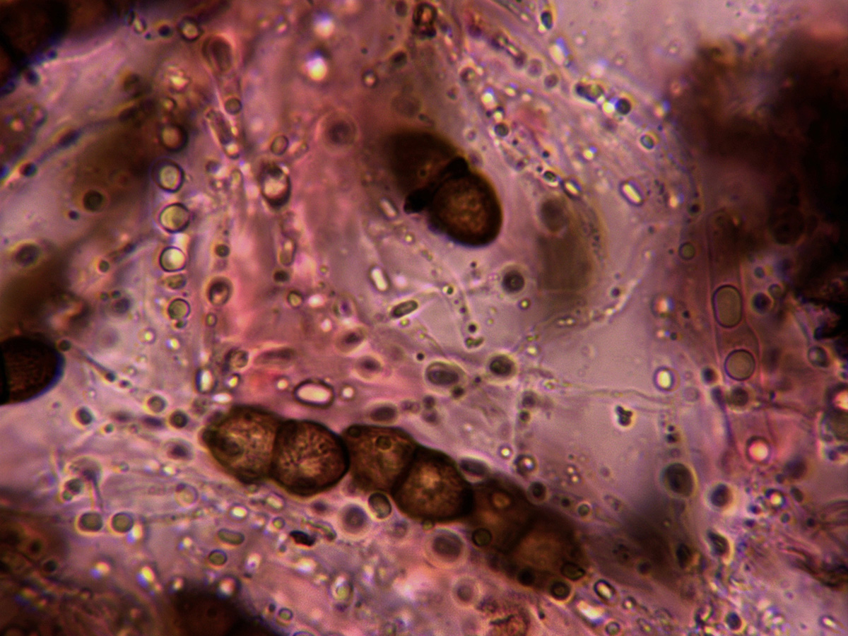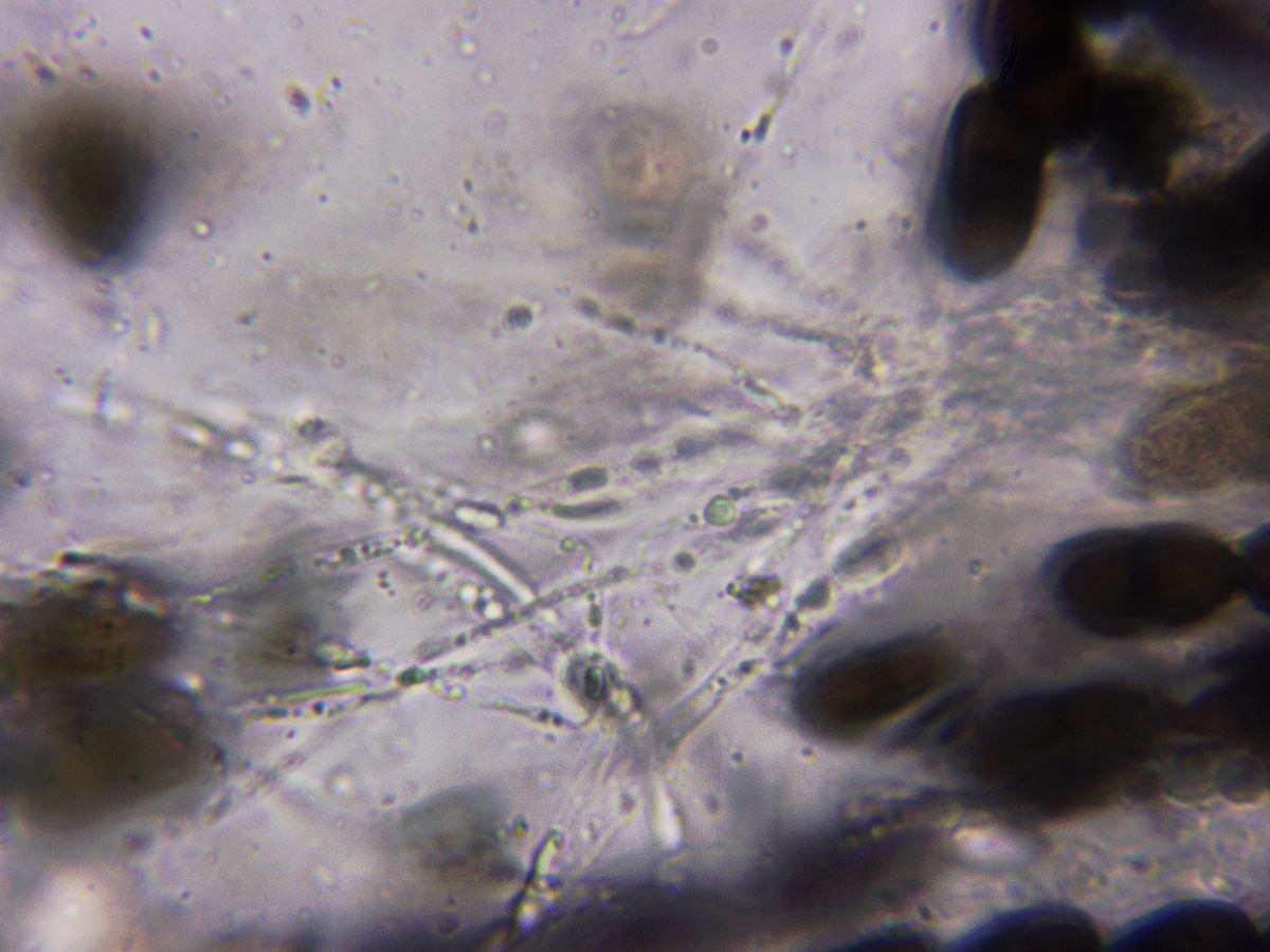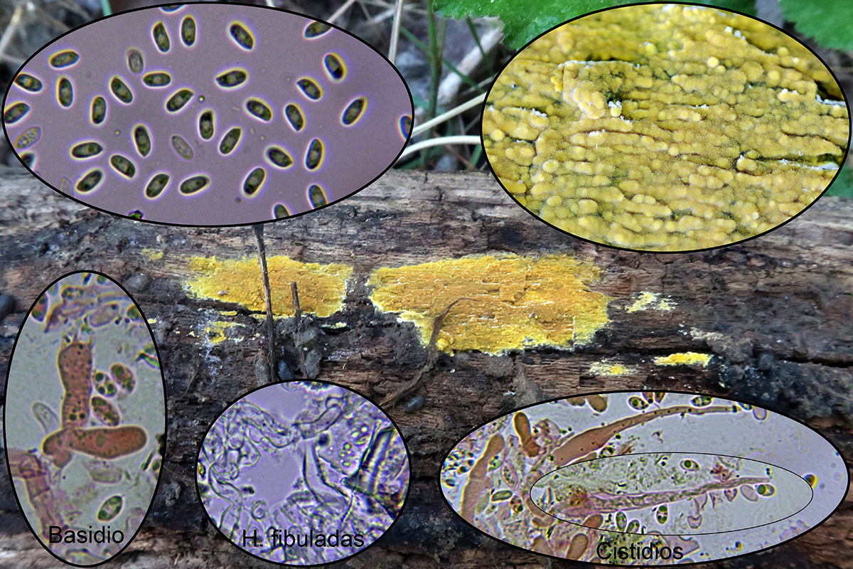 Con sus característicos cistidios sobresaliendo muy por encima del himenio, hifas con marcadas fíbulas y esporas en este caso con un tamaño algo por debajo del que se cita en la bibliografía del mismo: