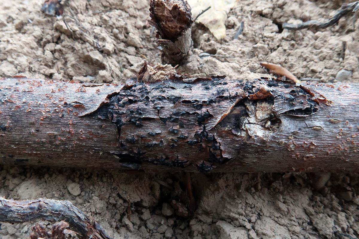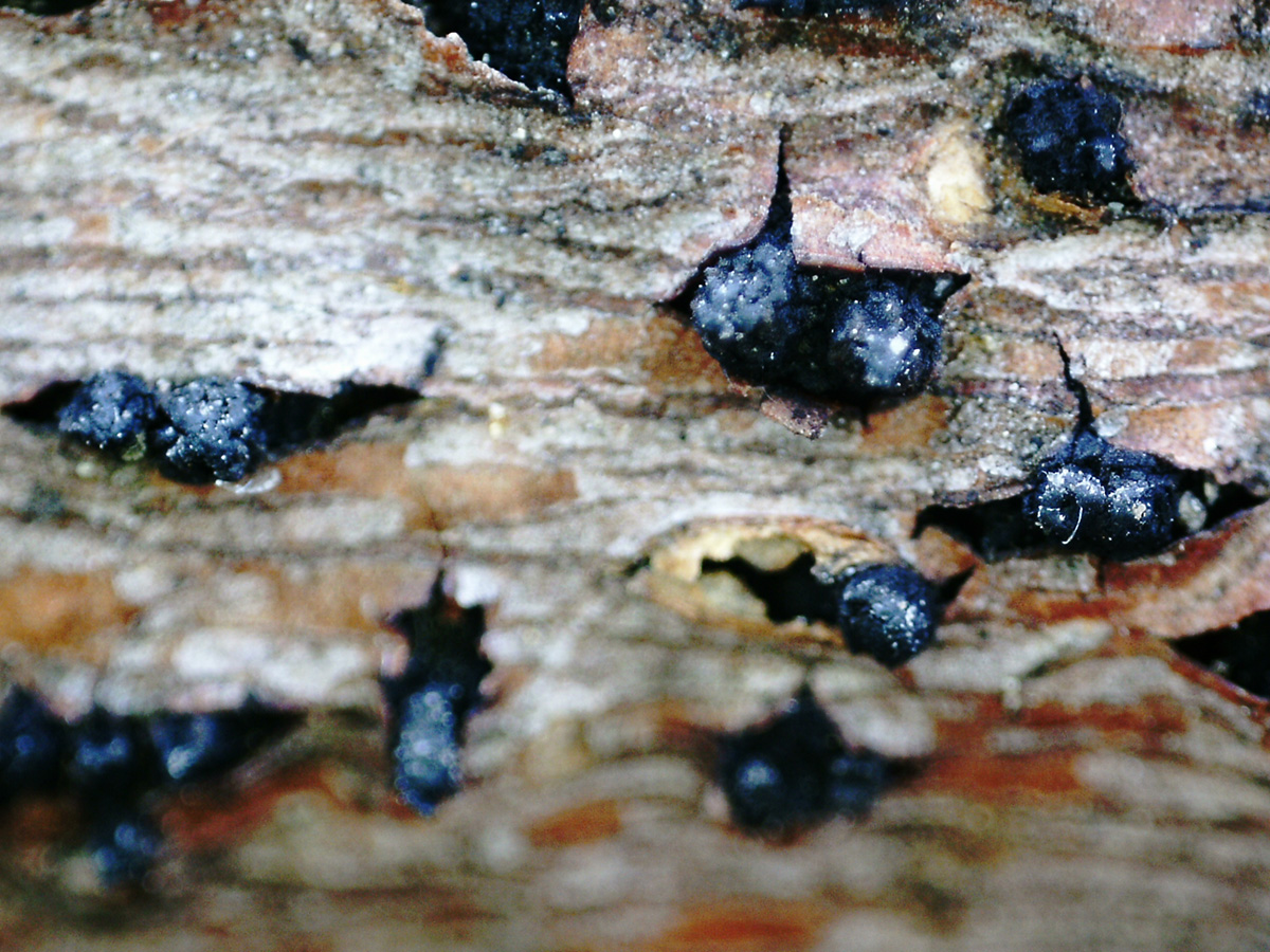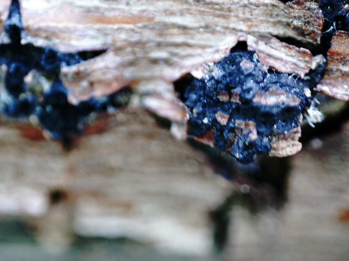 Pequeñas fructificaciones reventando la corteza al estilo de las Diartypella, muy arraigadas al tronco y de difícil extracción.