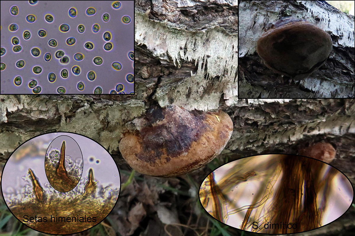 Con muy escasas setas himeniales, sistema dimítico y esporas con unas medidas de: