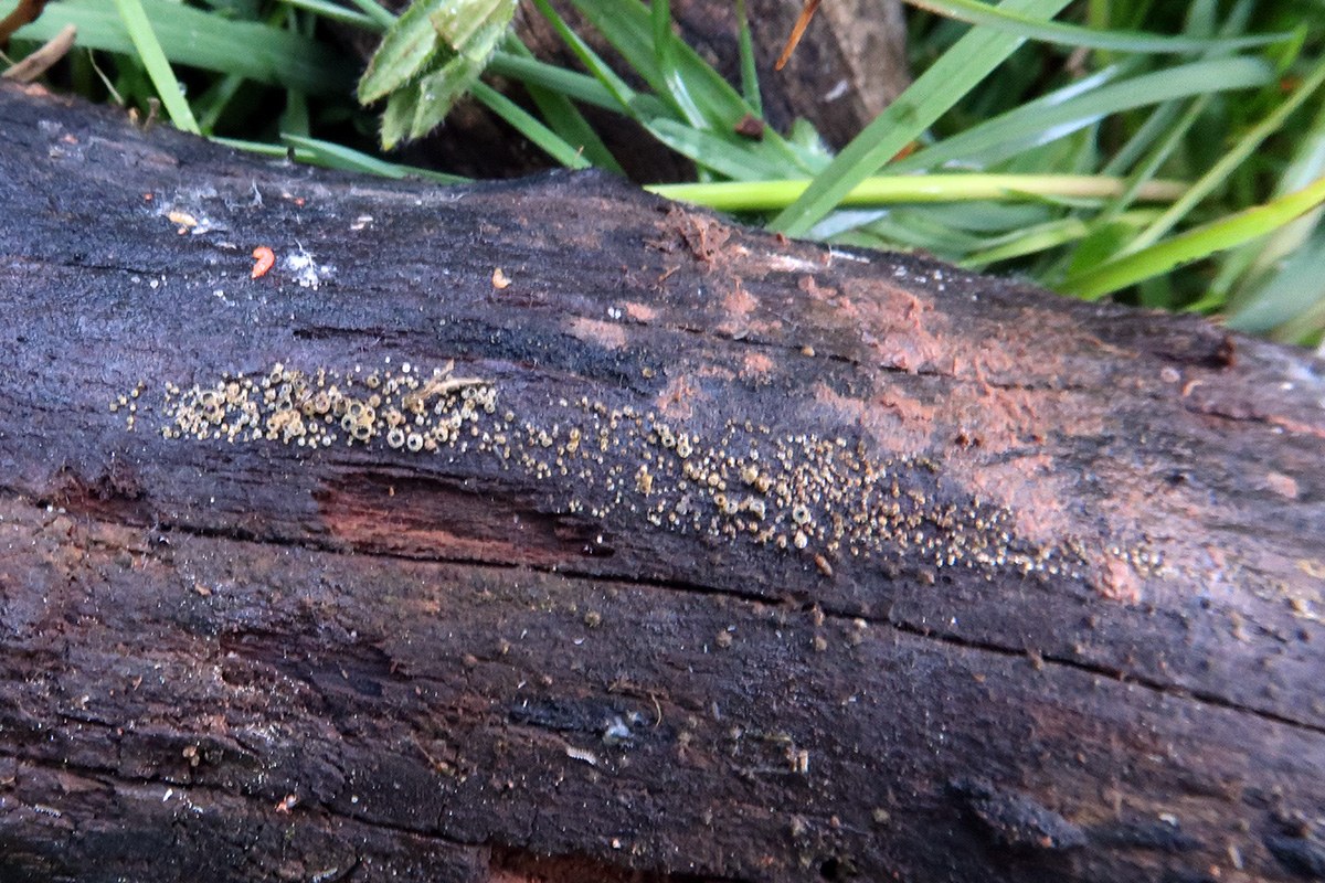 Un pequeño ascomiceto brotando por la parte de debajo de un tronco tumbado en campa de altura donde abundaba el espino albar "Crataegus monogyna".