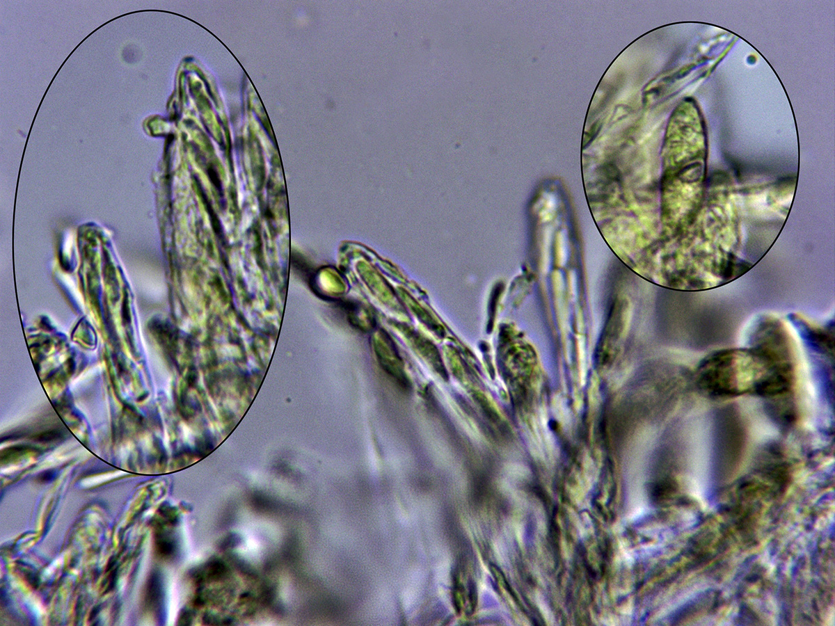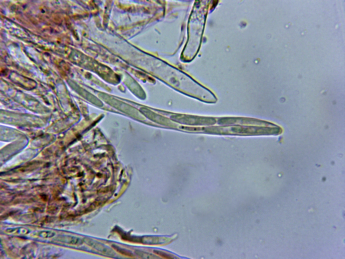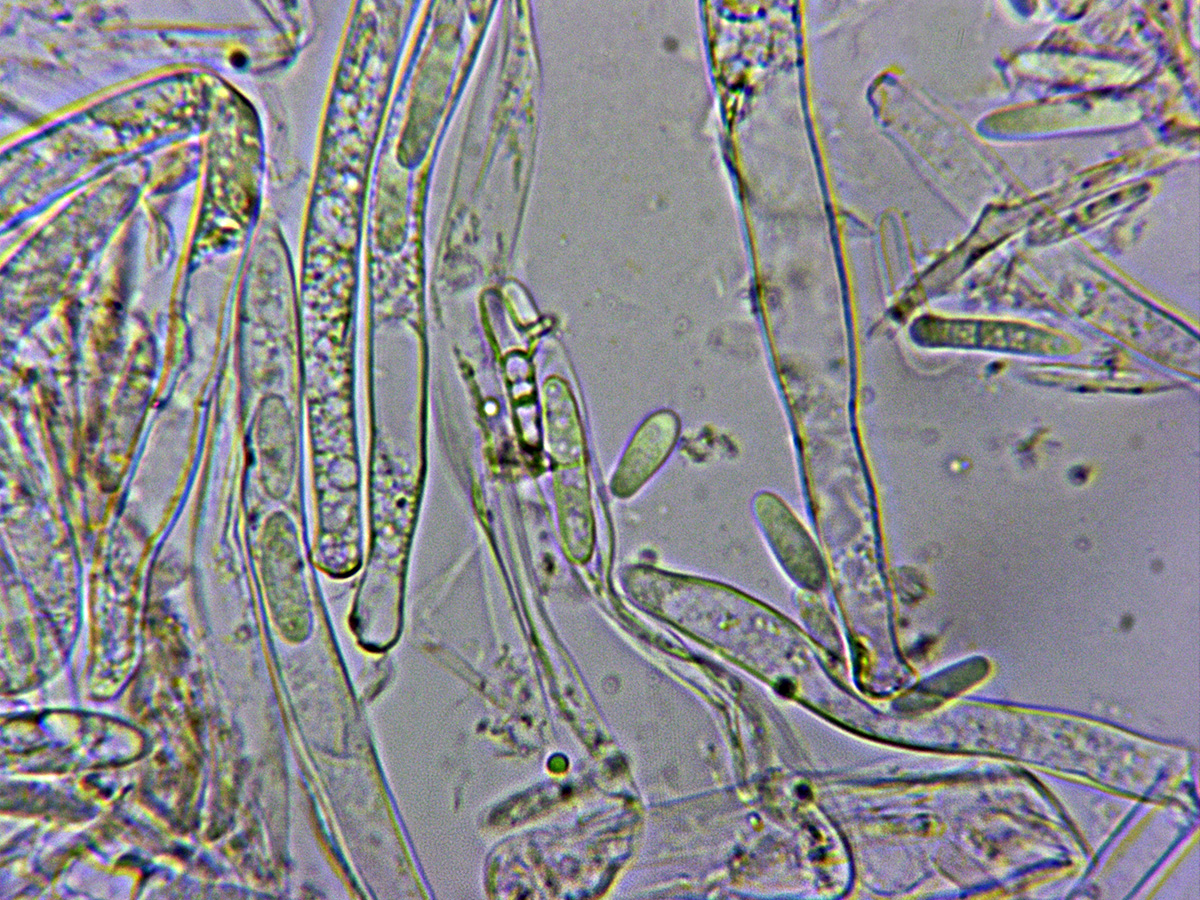 Ascas en reactivo de Melzer, con reacción amiloide en el ápice de las mismas.