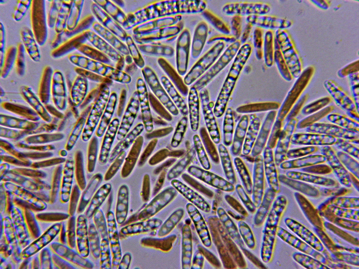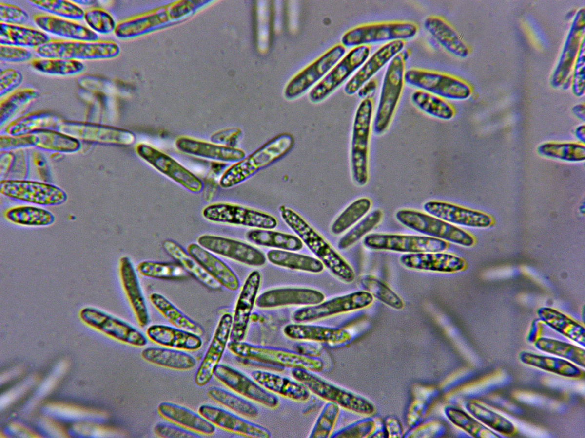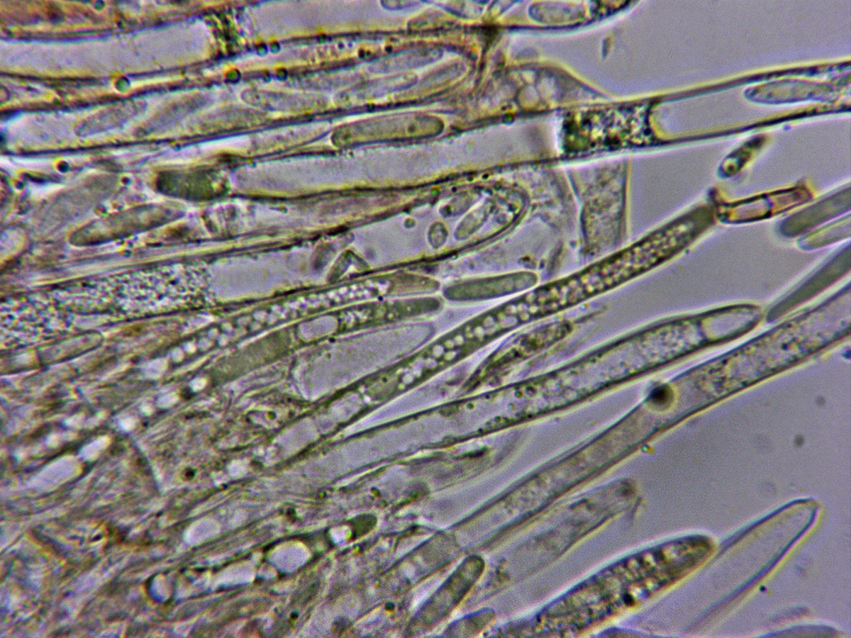 Ascas en reactivo de Melzer, con reacción amiloide en el ápice de las mismas.