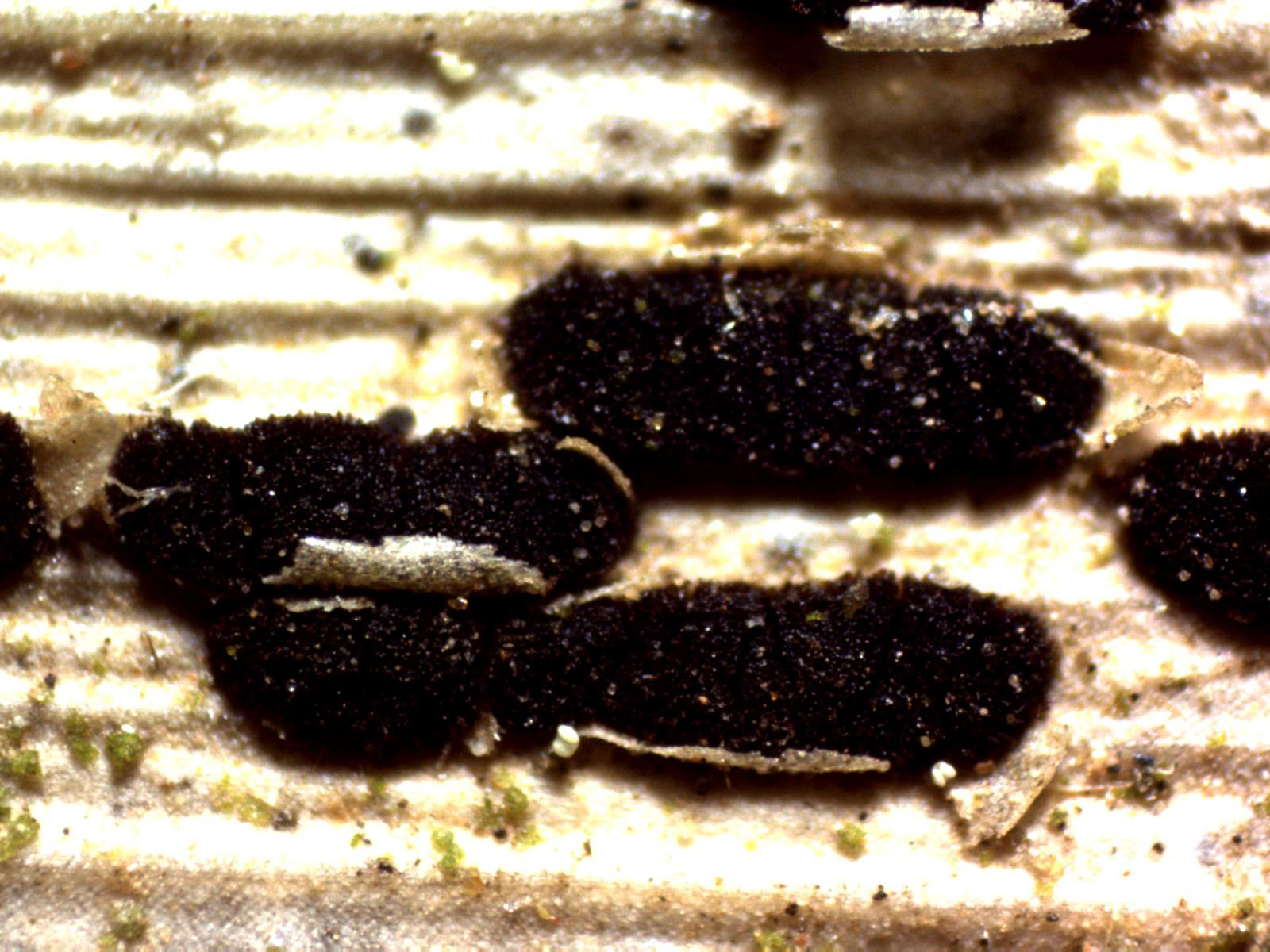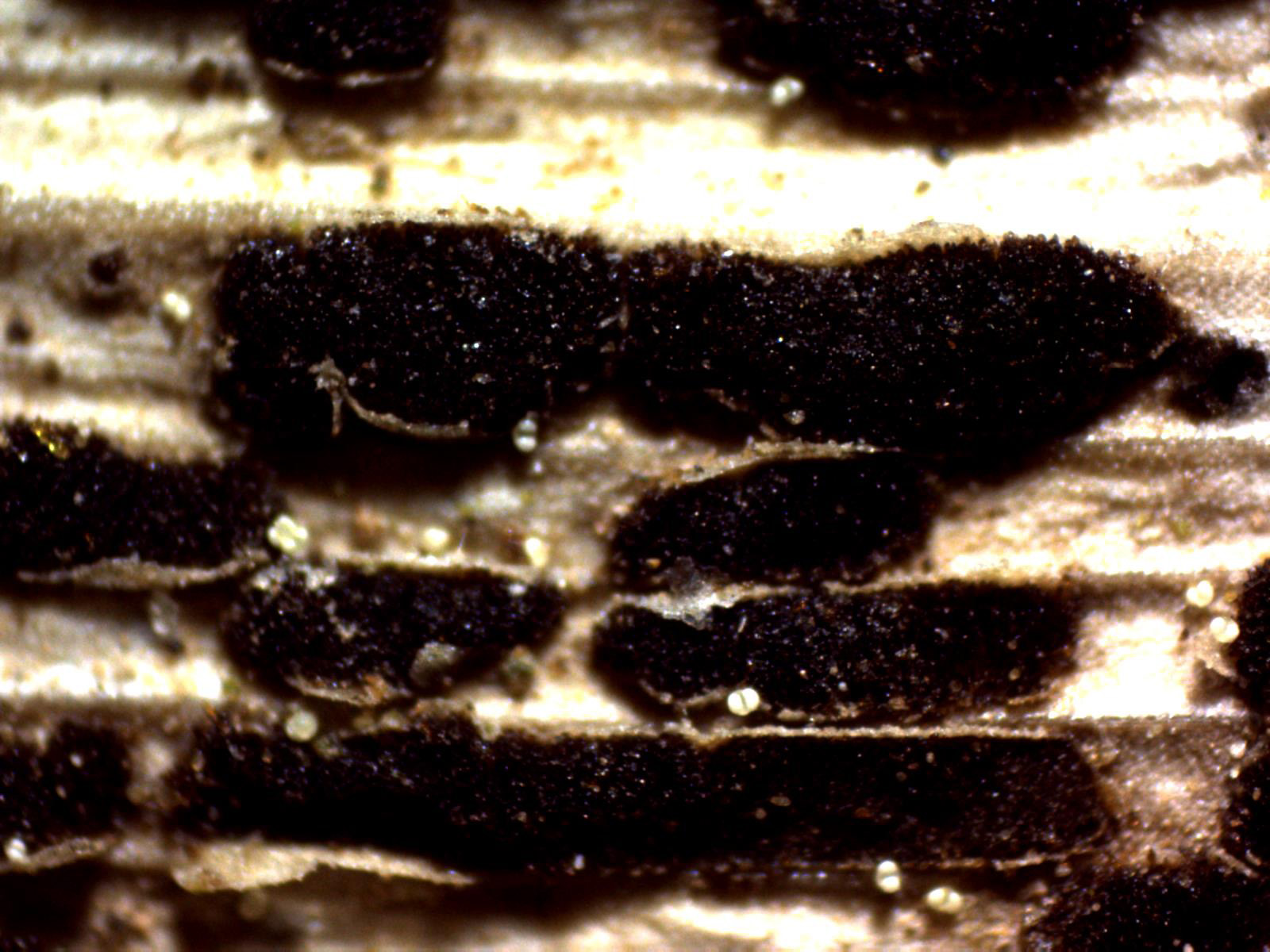 Este pasado domingo y sobre unas hojas secas de Phragmites australis, me encontré con las teliosporas que no pude localizar en su momento.
