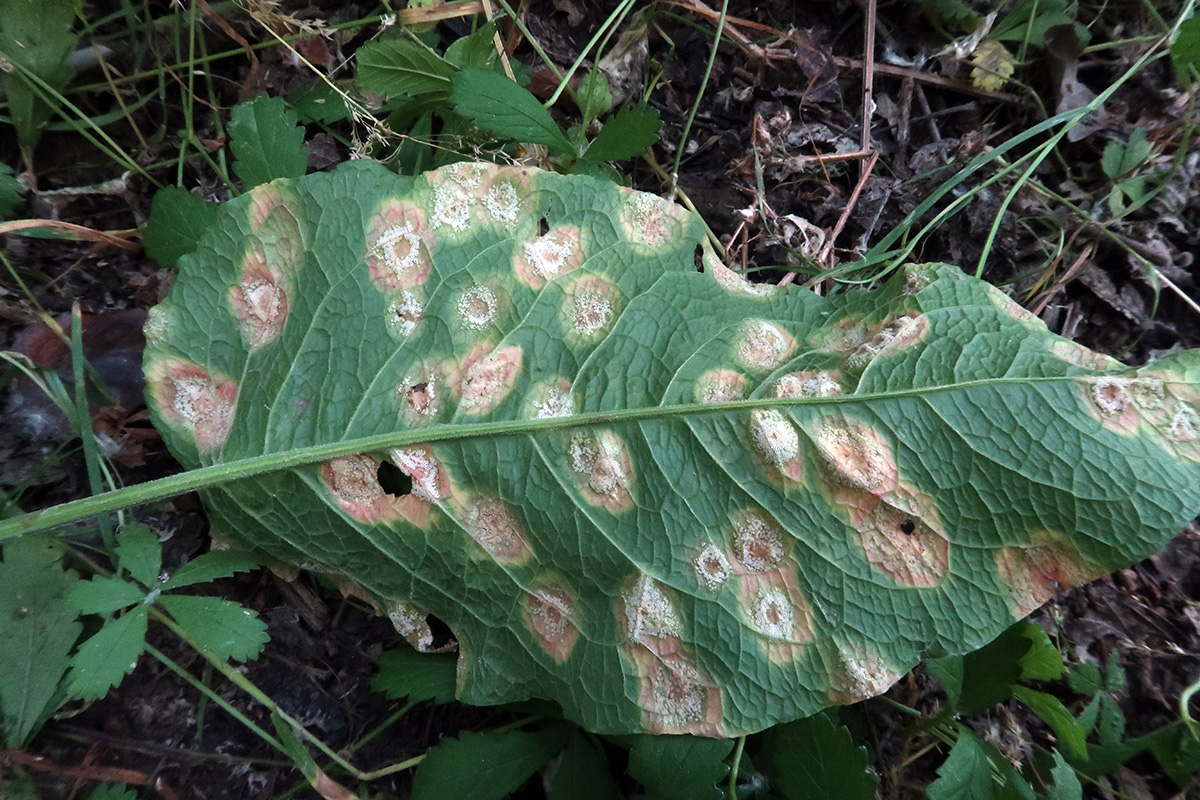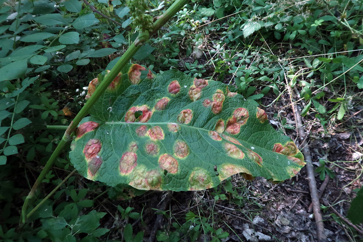 Una Puccinia en su primera fase (Fase Ecial) sobre hojas de Rumex obtusifolius, se trata de Puccinia phragmitis