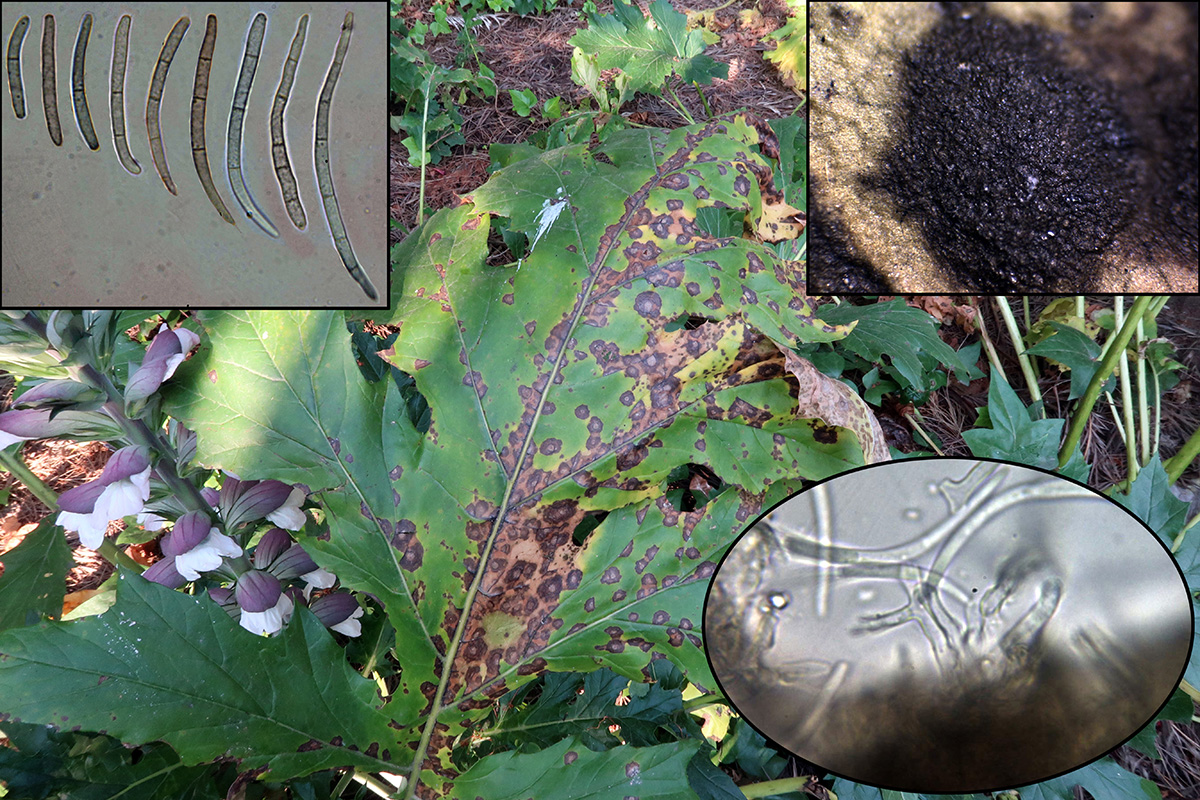 Y para terminar una Cercospora, en un parque público de Barcelona, sobre unas grandes hojas de Acanthus mollis (se pueden apreciar sus bellas flores a a la izquierda de la imagen). Con conidios de entre uno y hasta seis septos, se trata de la Cercospora acanthicola, recientemente incorporada al género Passalora como Passalora acanthicola