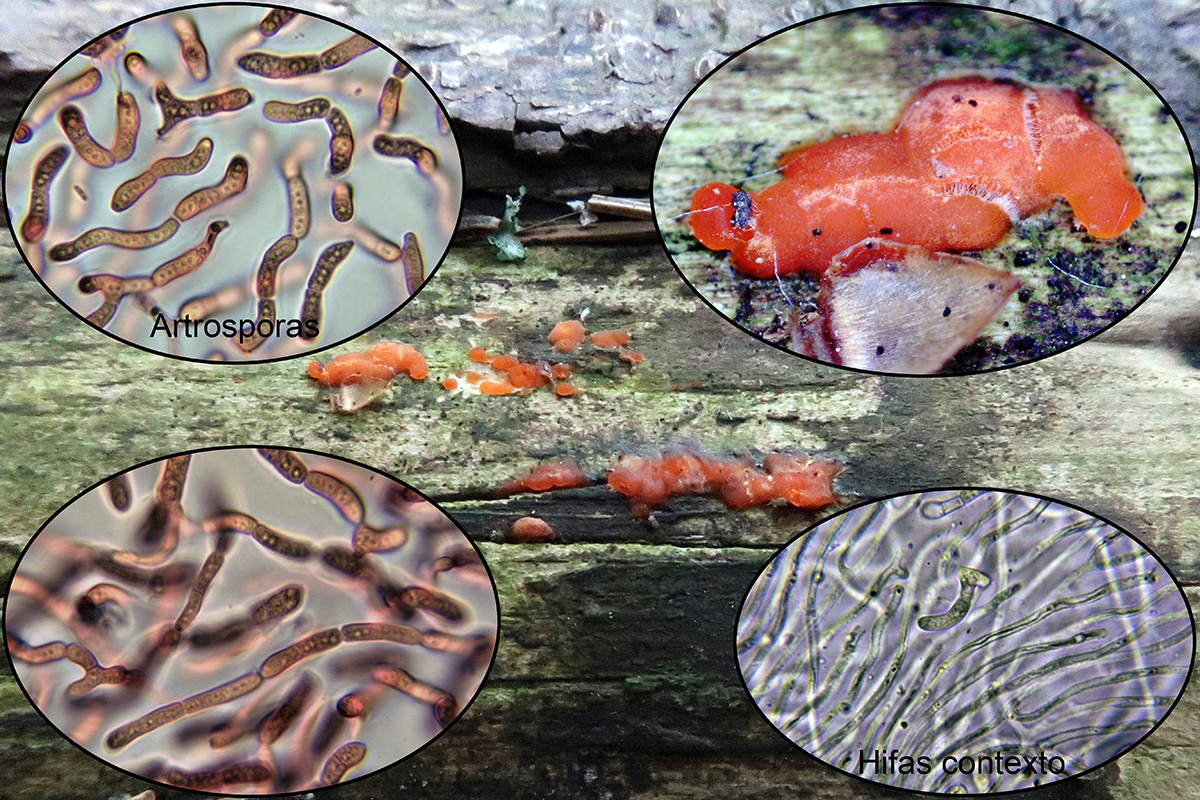 Del pasado 9 de Junio, de la recogida de muestras con los Fungimasters, un Dacrymyces en una fase que no me había encontrado nunca, probablemente Dacrymyces stillatus, con sus curiosas artrosporas.
