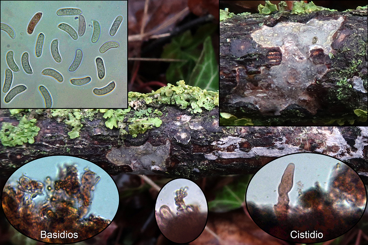 Una del 25 de Marzo de 2018, una Vuilleminia cercana a la Vuilleminia comedens, atendiendo a las medidas esporales, principalmente a la anchura, las claves me llevan a la Vuilleminia cystidiata y a la Vuilleminia pseudocystidiata, la morfología de sus cistidios encaja mejor con la Vuilleminia pseudocystidiata