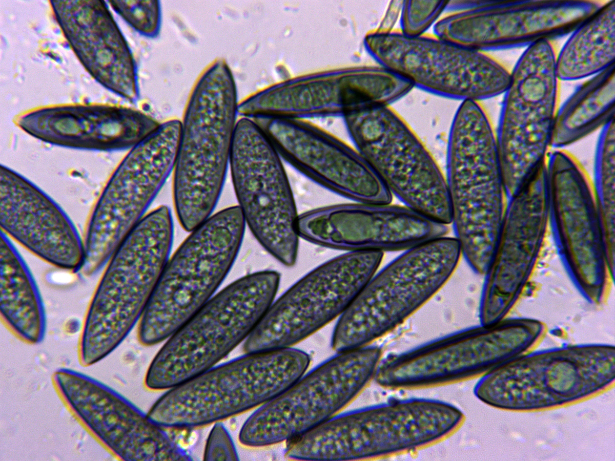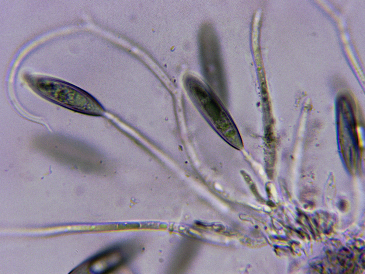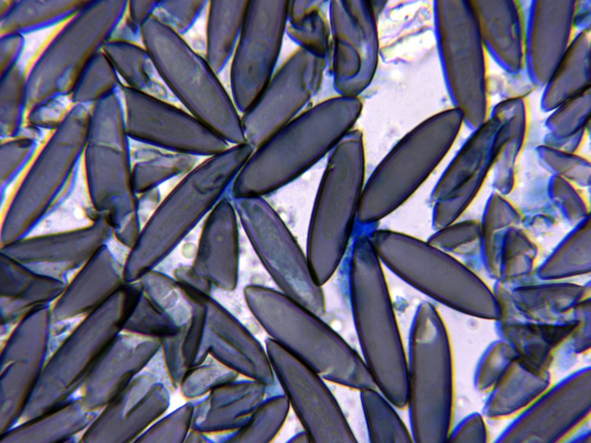 Conidios en KOH, en este caso se oscurecieron sensiblemente a azul.