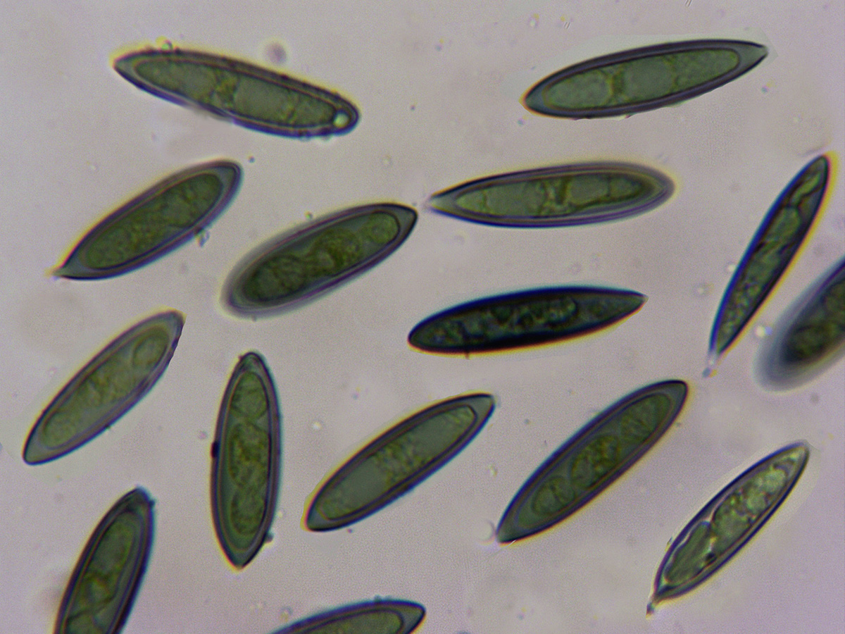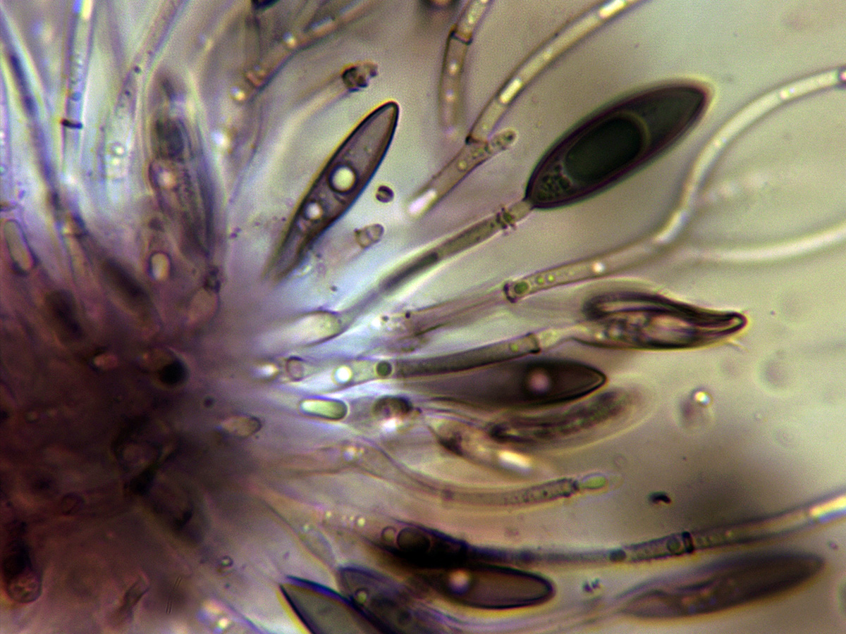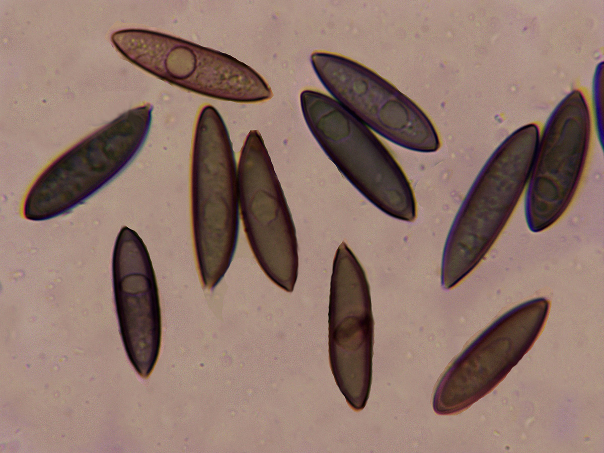 Conidios en KOH, en este caso se oscurecieron sensiblemente a azul.
