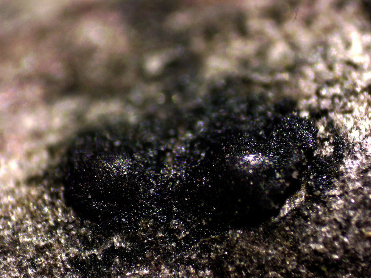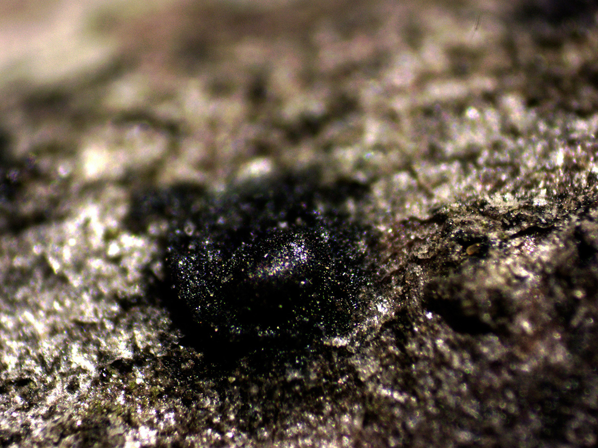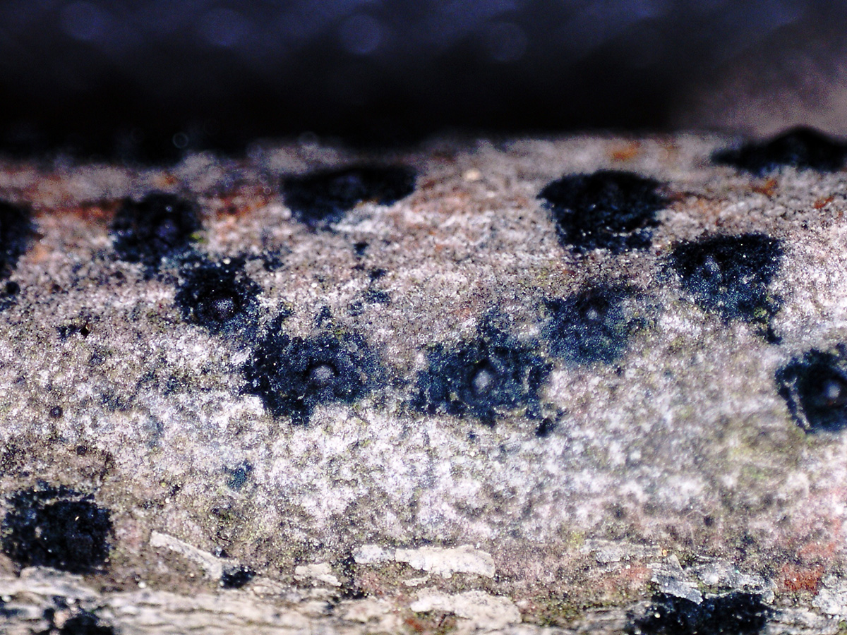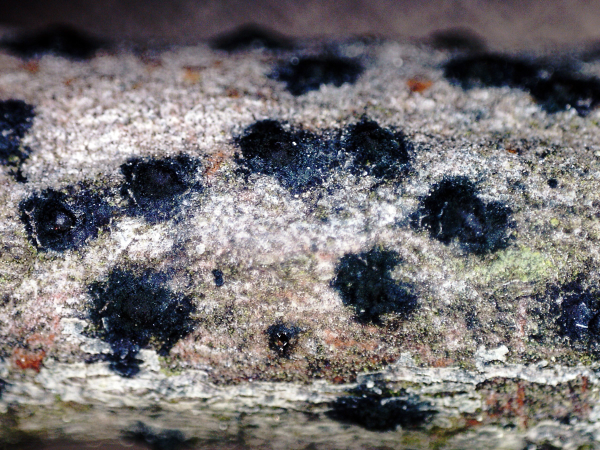 Muy diminutas fructificaciones a modo de granos de color negro, brotando de manera dispersa pero abundante por la superficie del tronco.