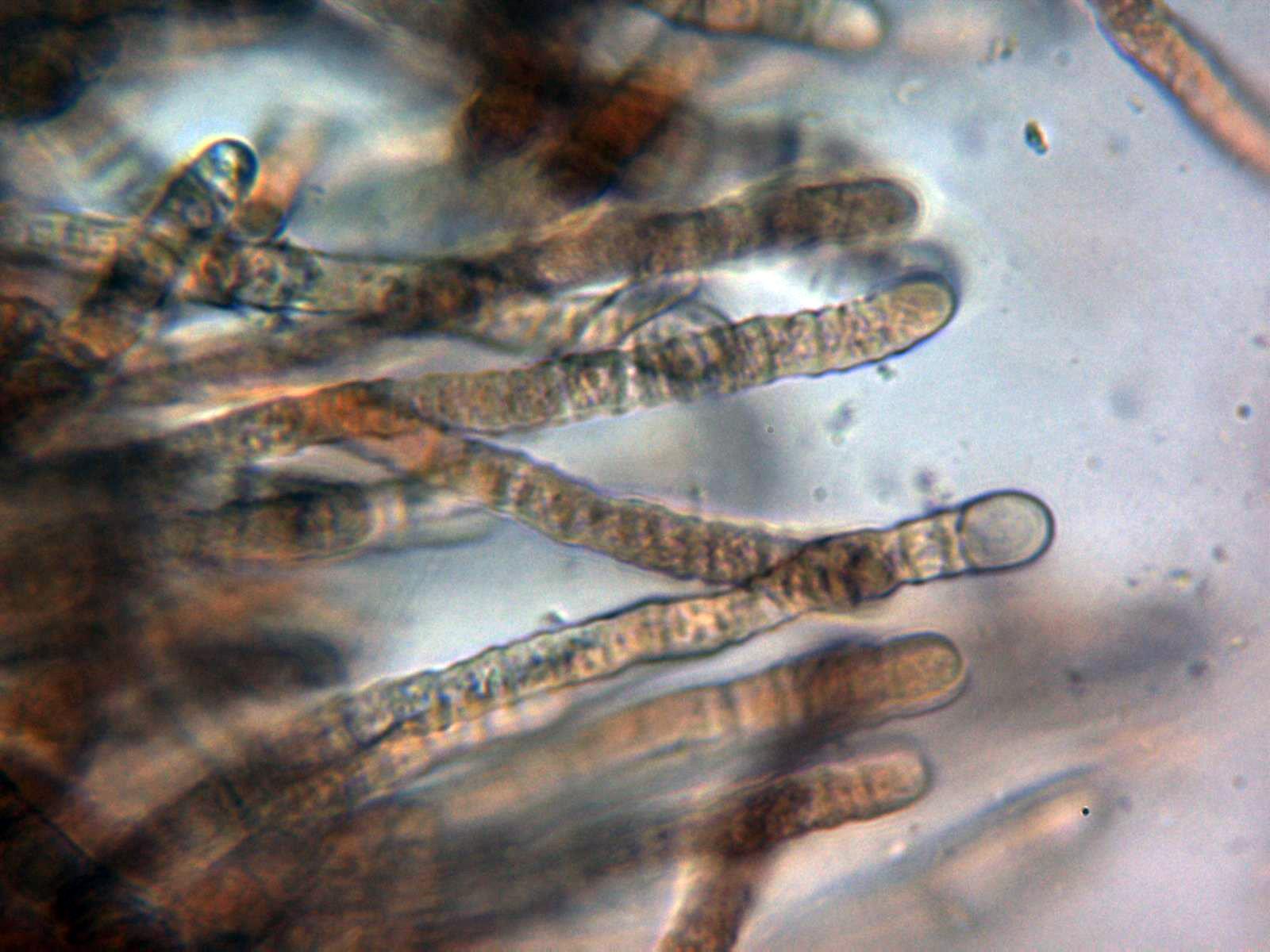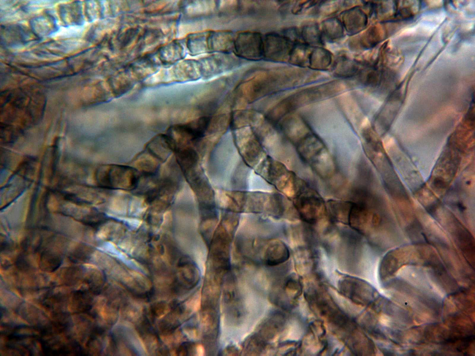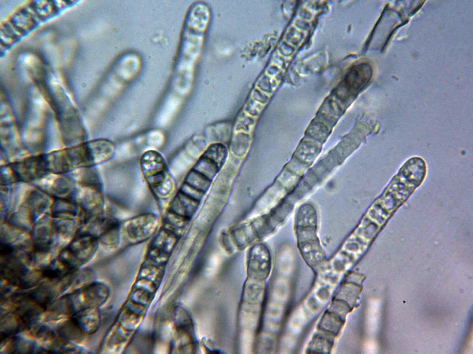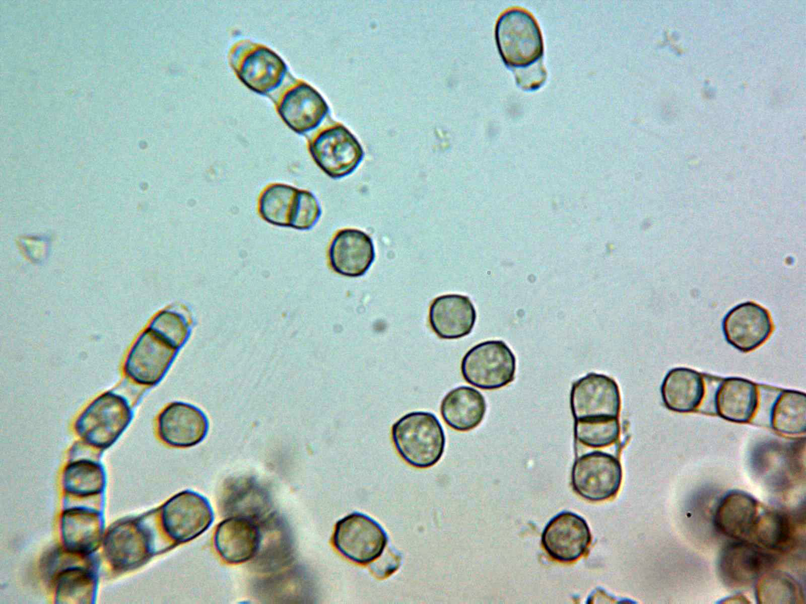 En la microscopía poco a destacar, solo unas hifas conidiógenas a modo de empalizada, algunas de ellas bifurcadas, que se van fragmentando en trozos entre hexagonales y circulares, a modo de conidios, con unas medidas de entre 6,4 a 7,3 µm.