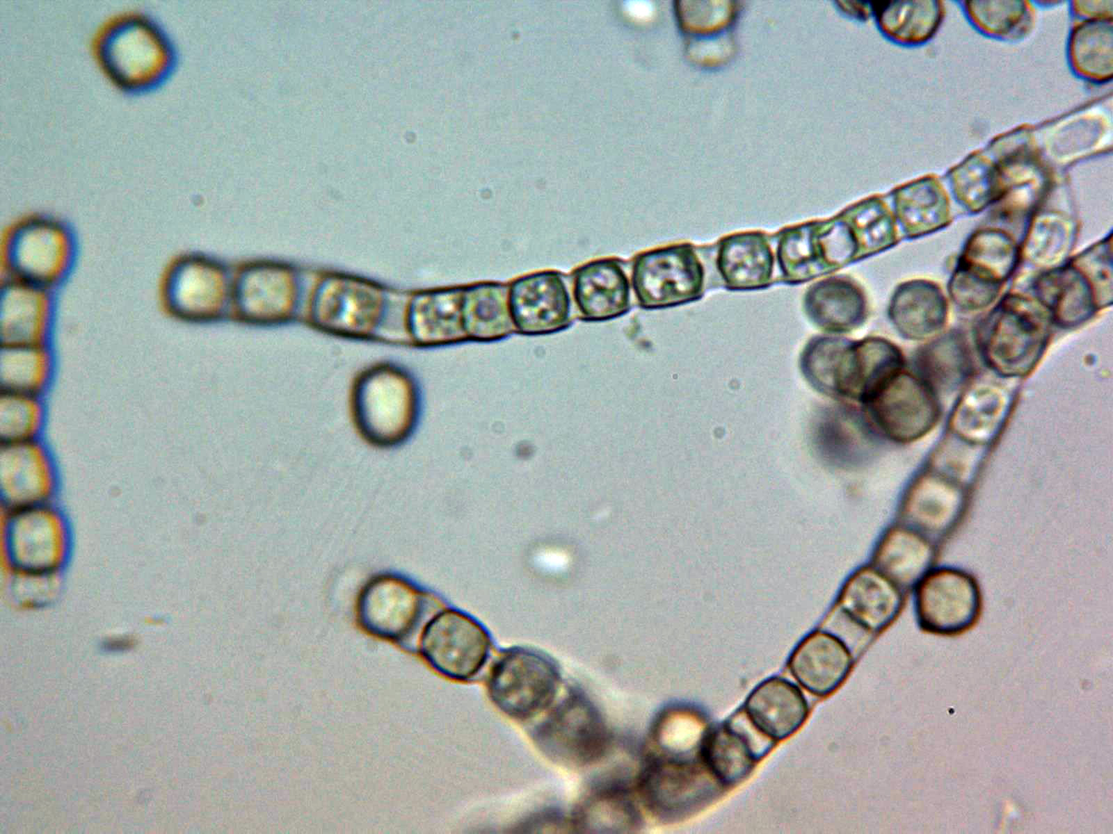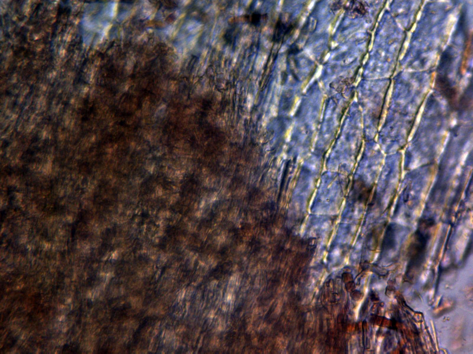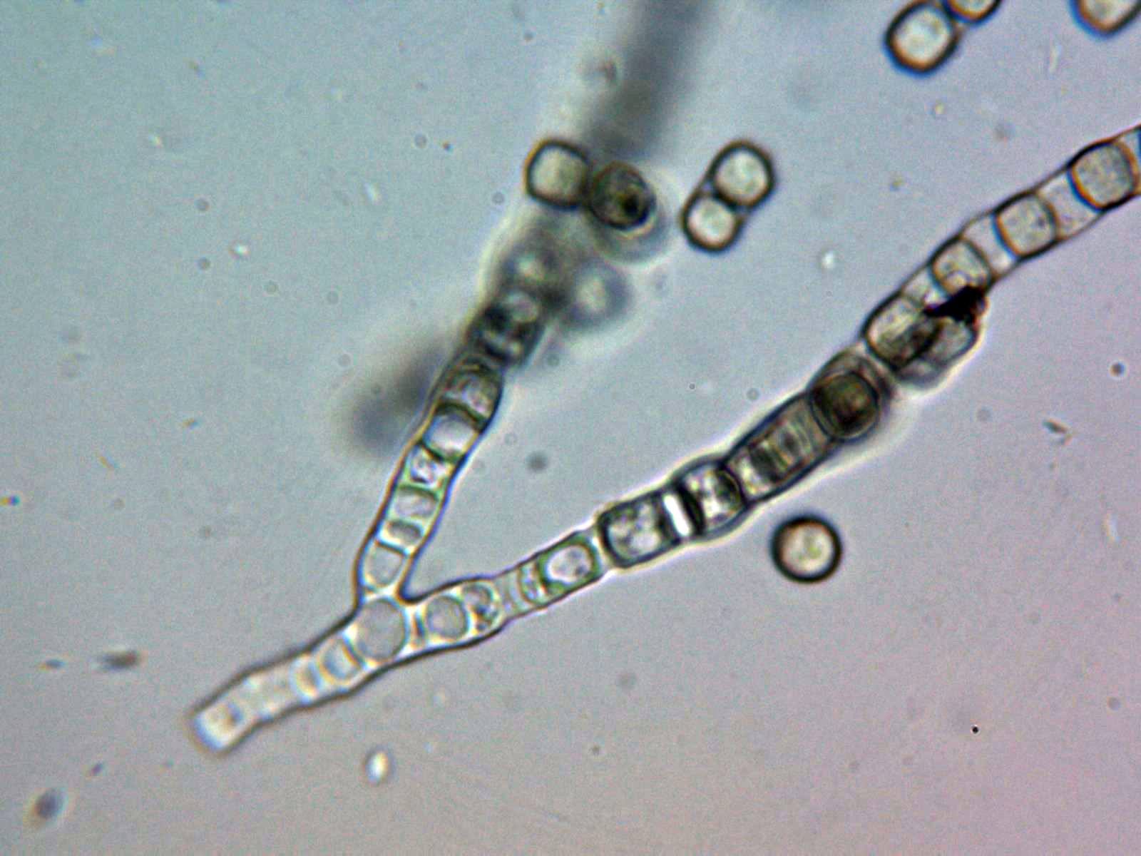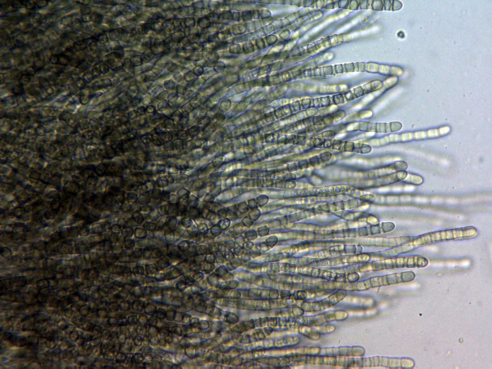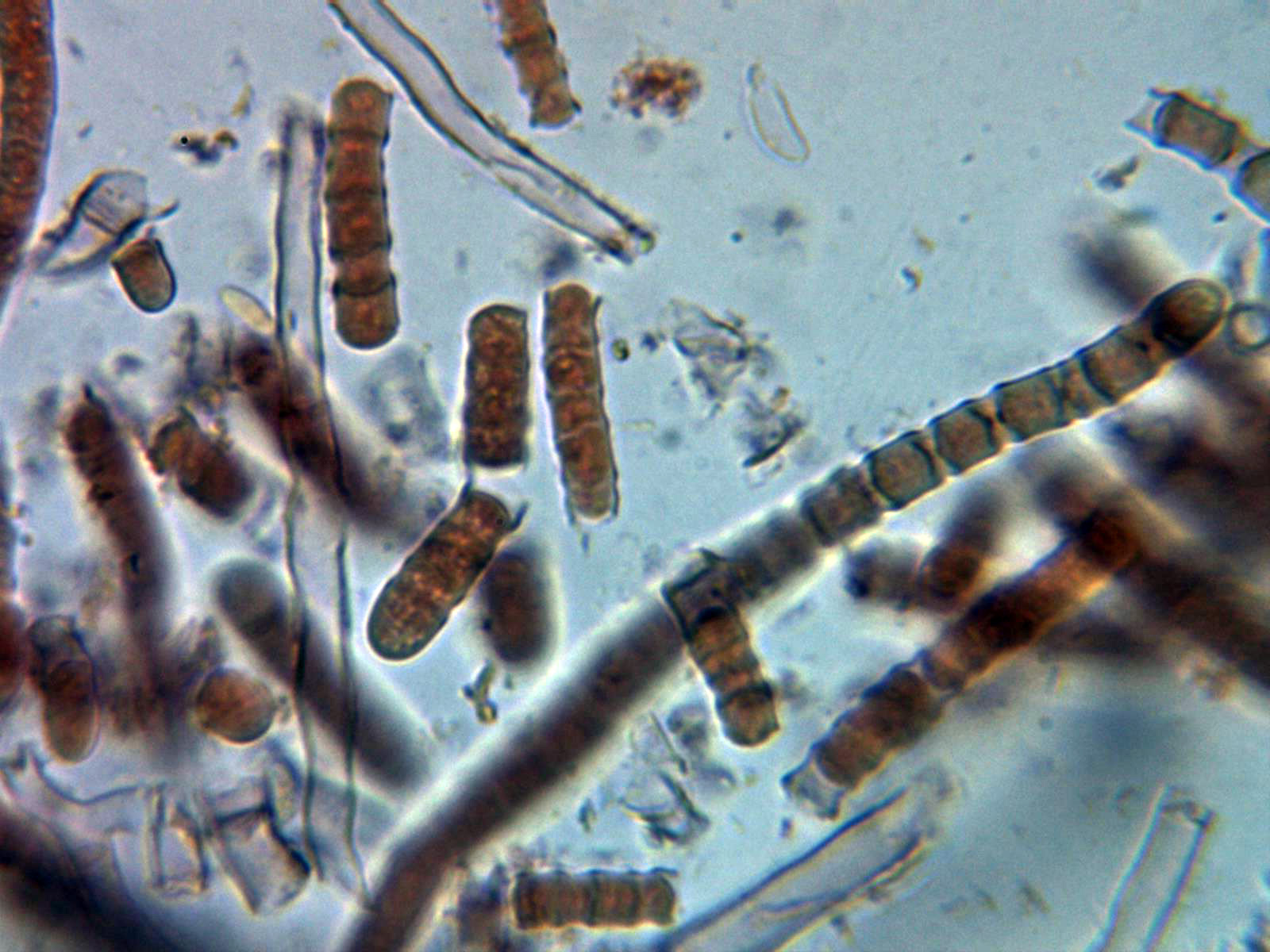 En la microscopía poco a destacar, solo unas hifas conidiógenas a modo de empalizada, algunas de ellas bifurcadas, que se van fragmentando en trozos entre hexagonales y circulares, a modo de conidios, con unas medidas de entre 6,4 a 7,3 µm.