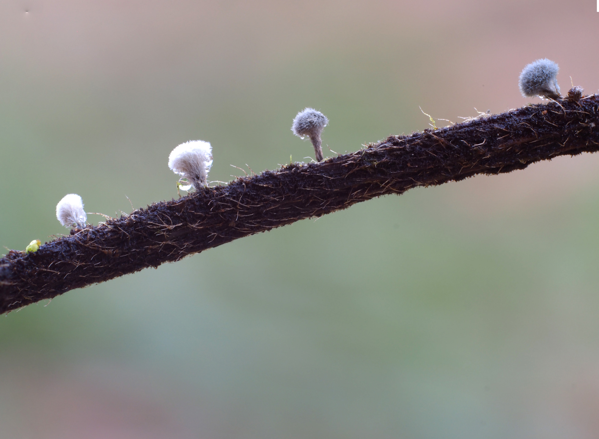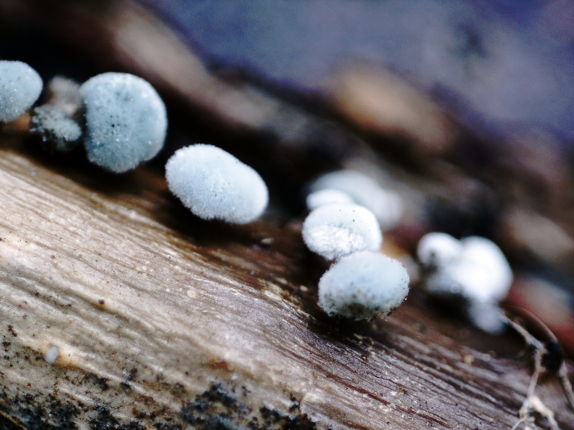 Pequeñas fructificaciones de entre 1,2 a 3 mm., con forma globosa y un pequeño pero diferenciado pié, de color blanco en un principio para pasar a coloraciones verde azuladas en estado adulto.