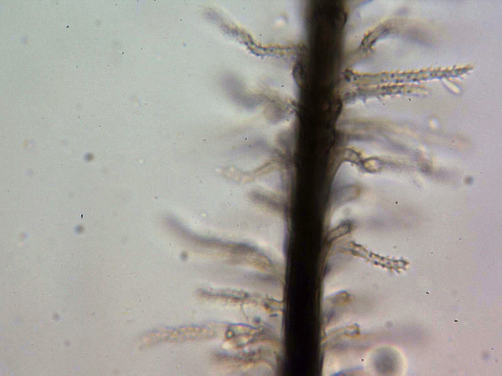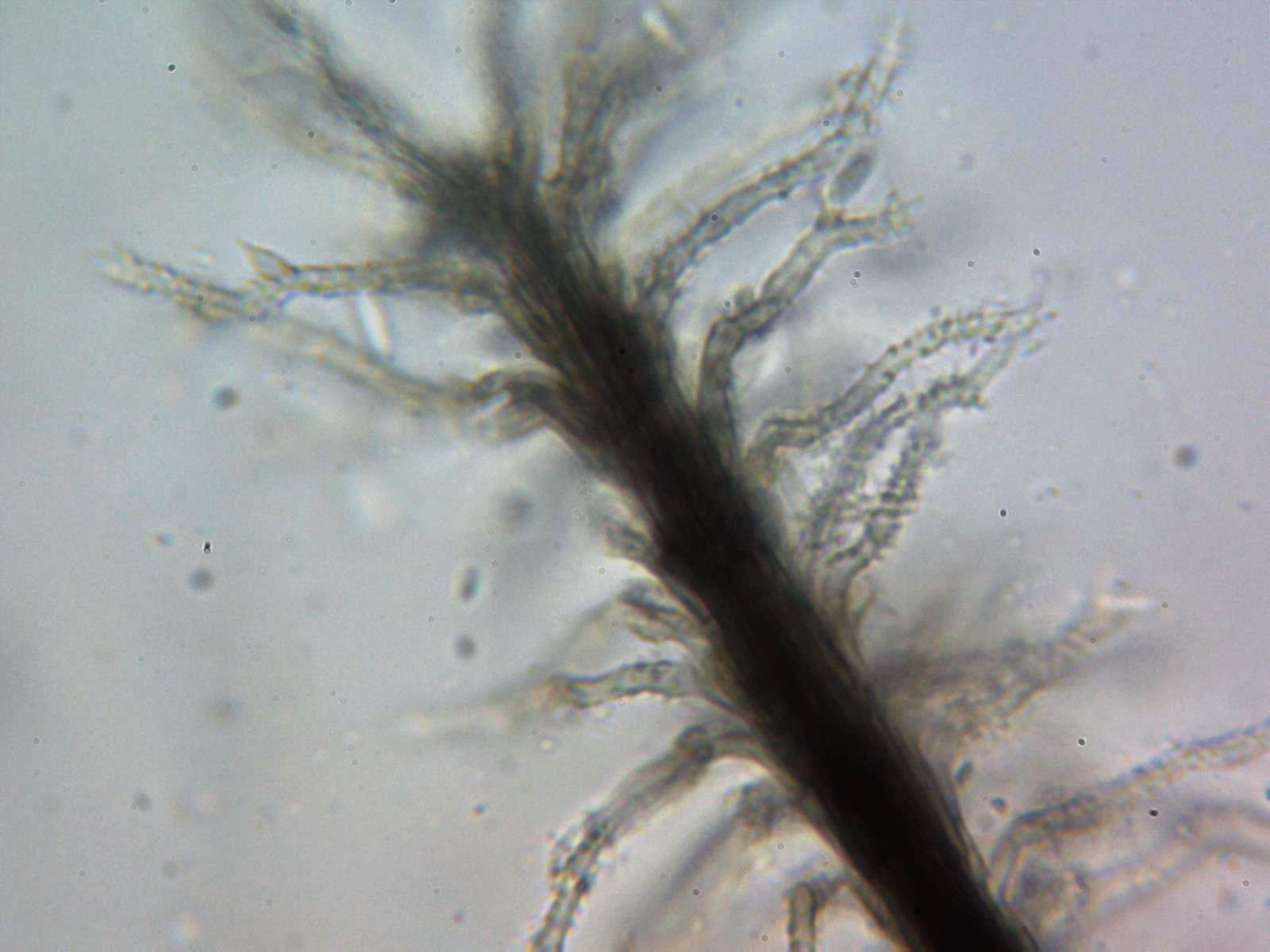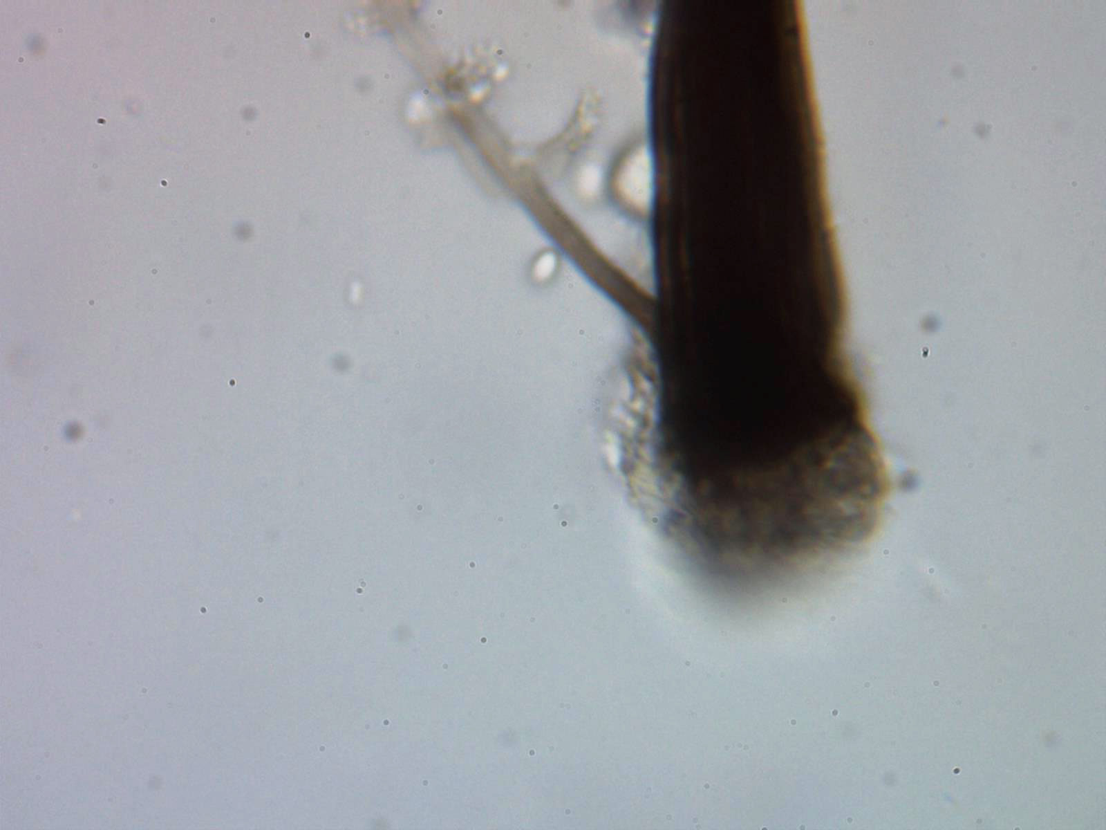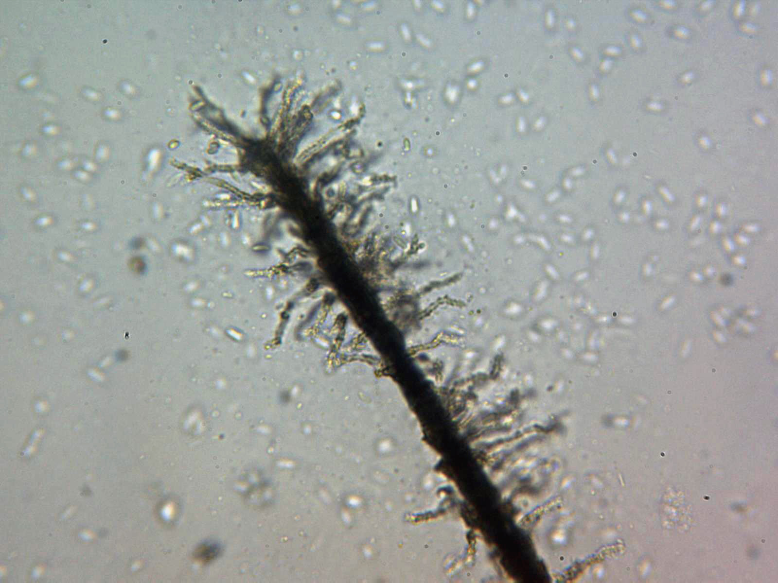 Con un tallo oscuro a modo de columna, con hifas muy pigmentadas de color marrón y dispuestas paralelamente. Una imágen de la base del pié: