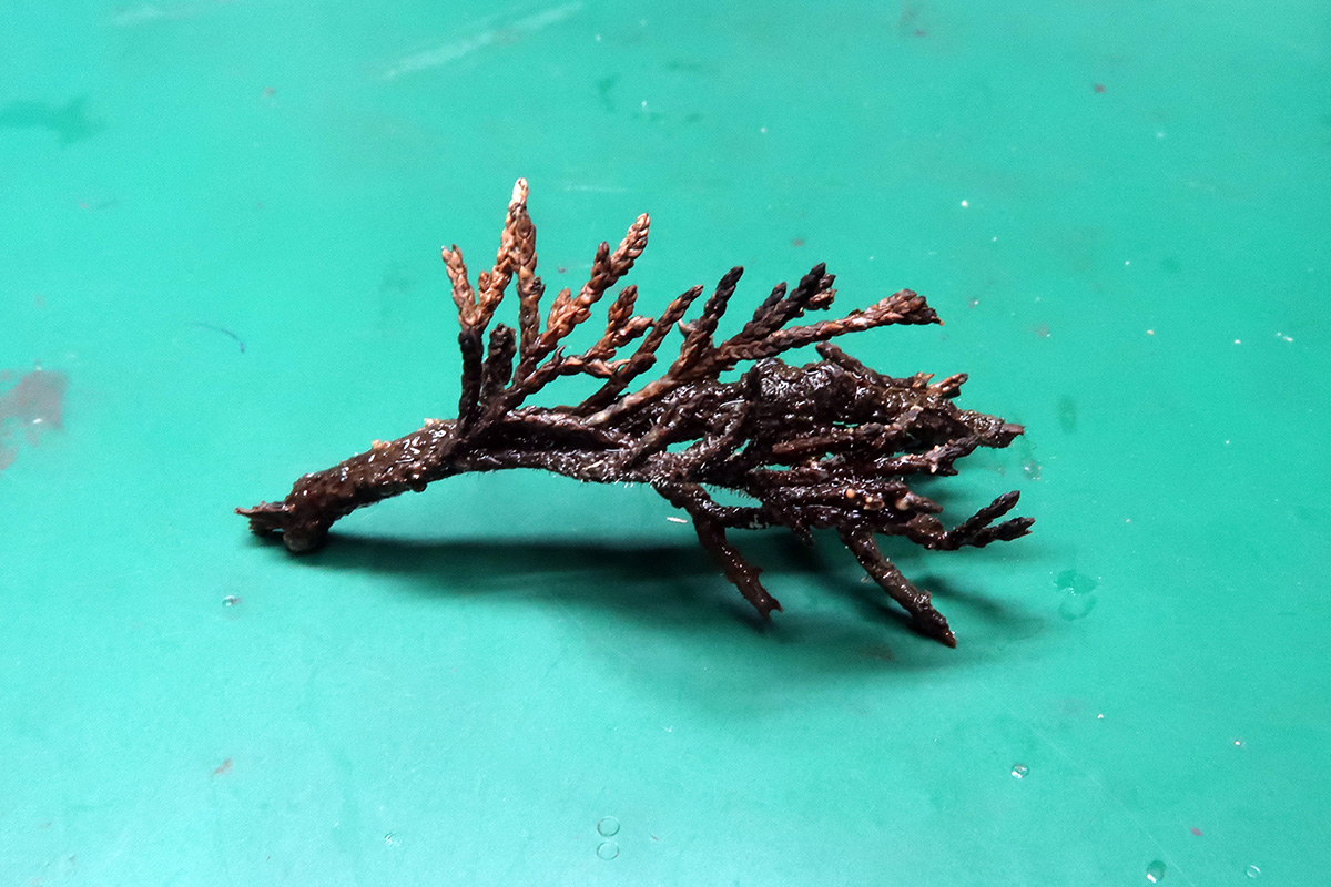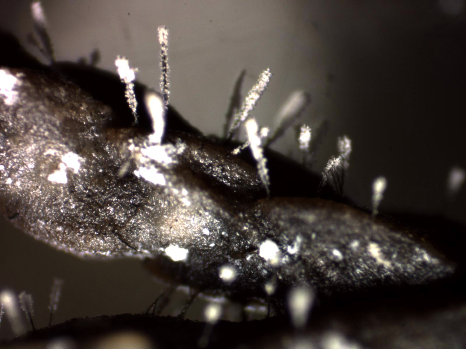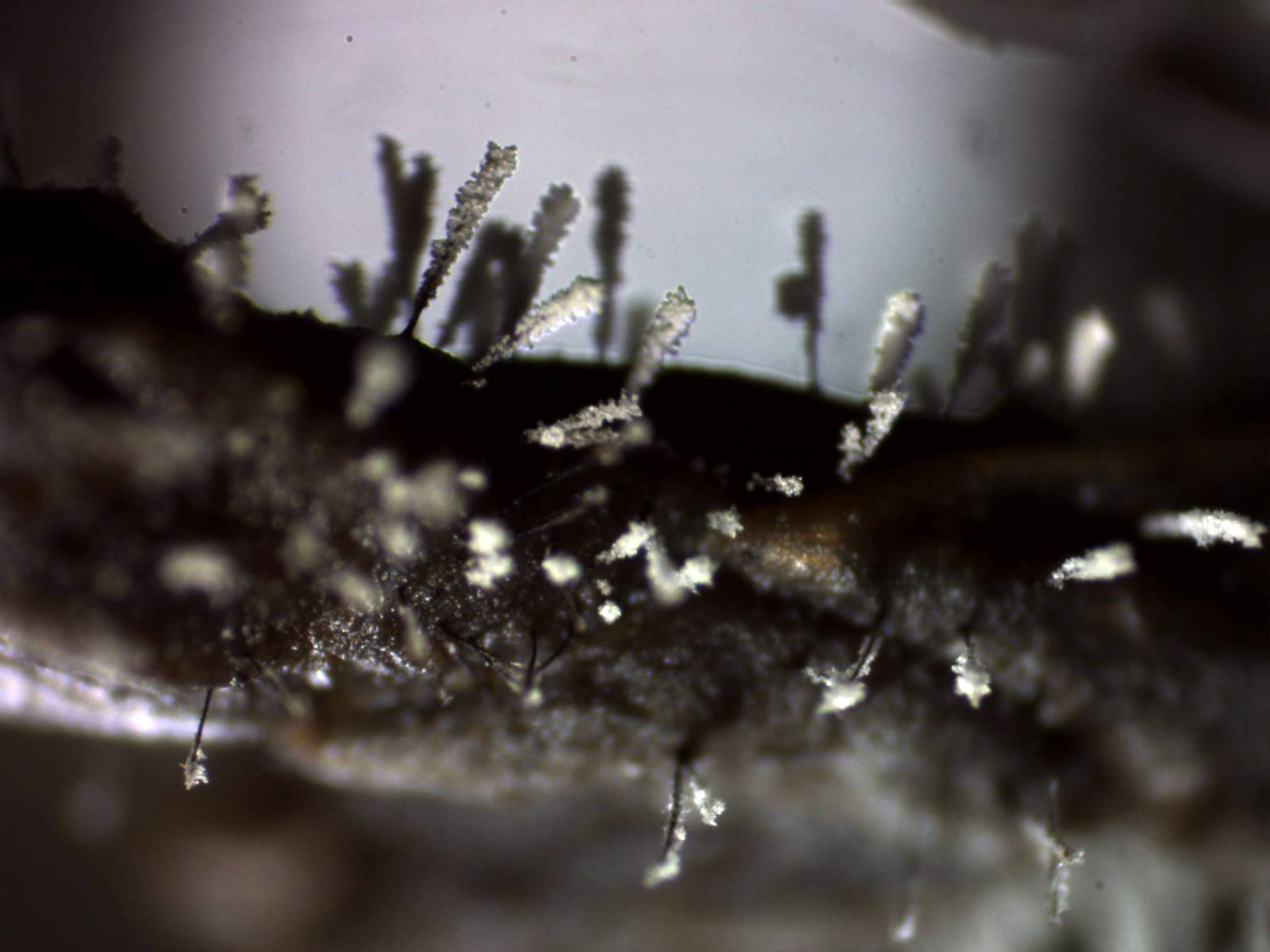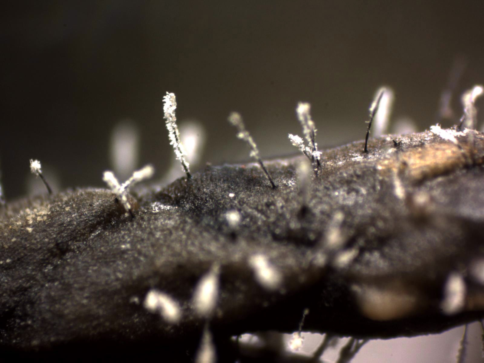 Un muy pequeño hongo creciendo sobre unas hojas muy degradadas de Juniperus thurifera, y también sobre unos pequeños excrementos sobre un pequeño tronco muy cercanos. Este hongo ha aparecido después de varios meses de conservación de una muestra en una cámara hidratada y una temperatura de entre 18 y 24º. Agradecer a Angel Pintos su ayuda en la identificación de la misma.