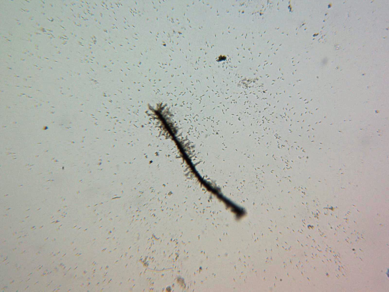 Conidios en agua destilada, en la primera imagen cubriendo toda la superficie.