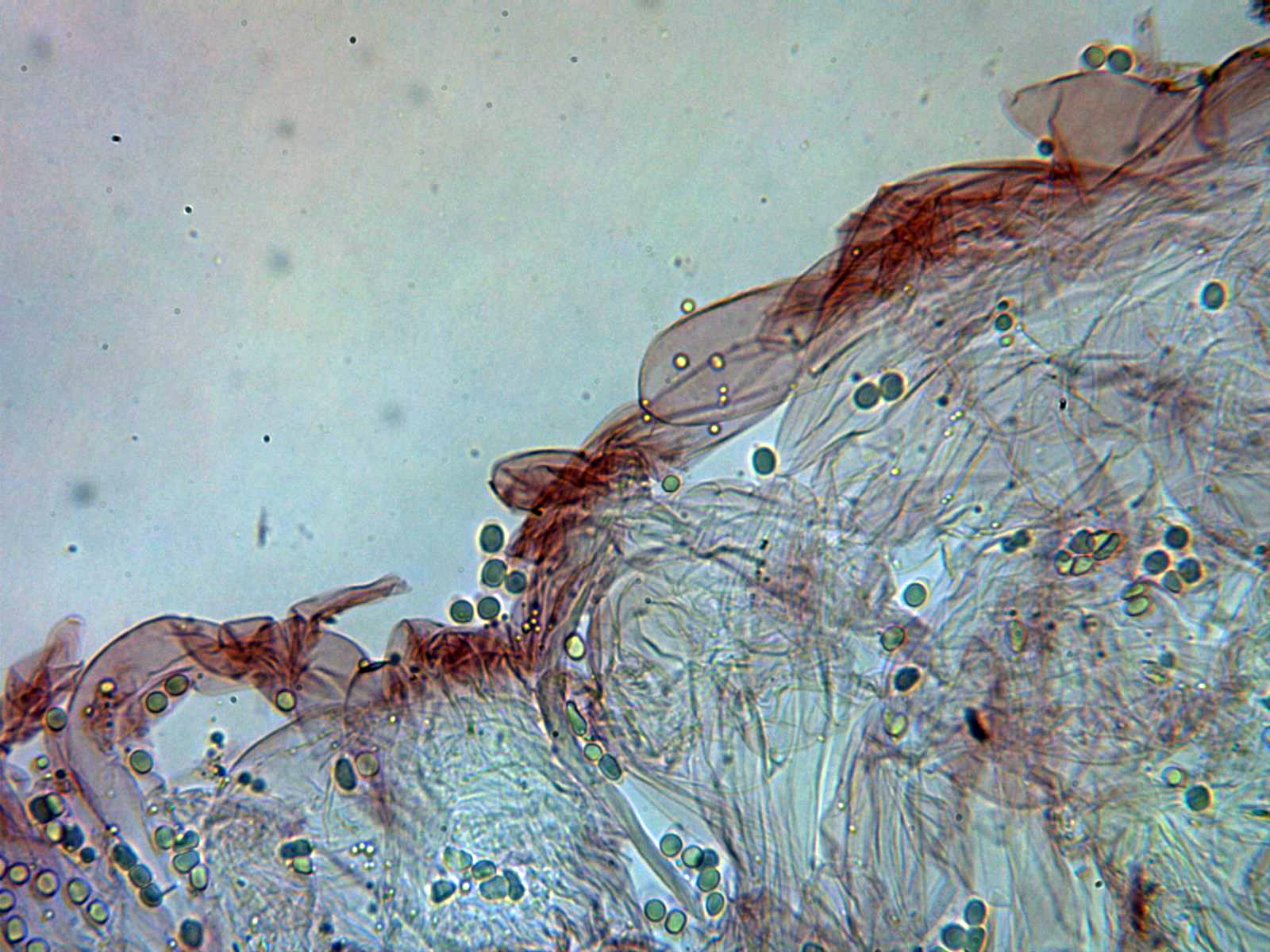 Caulocistidios escasos en el pié con hifas de su superficie con digitaciones cortas.