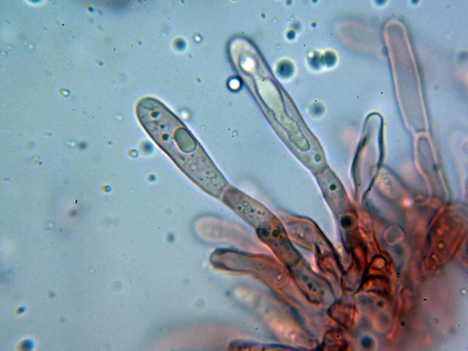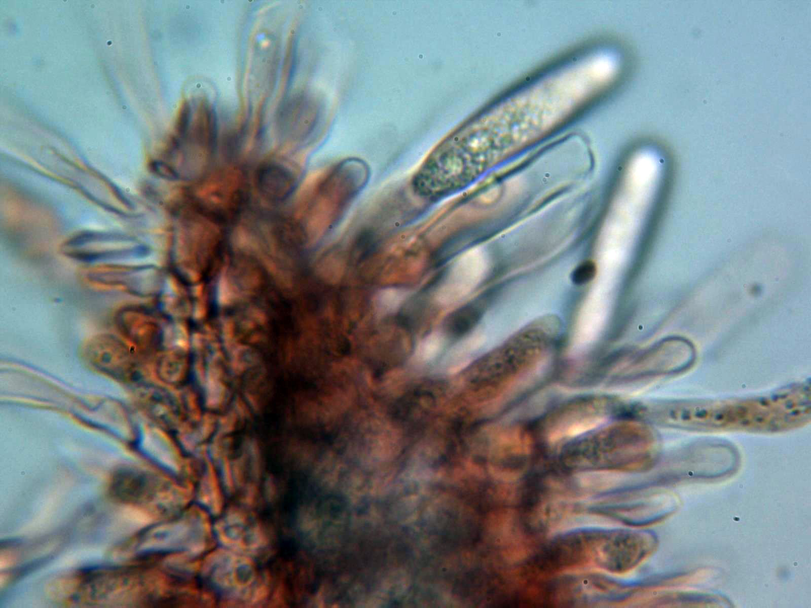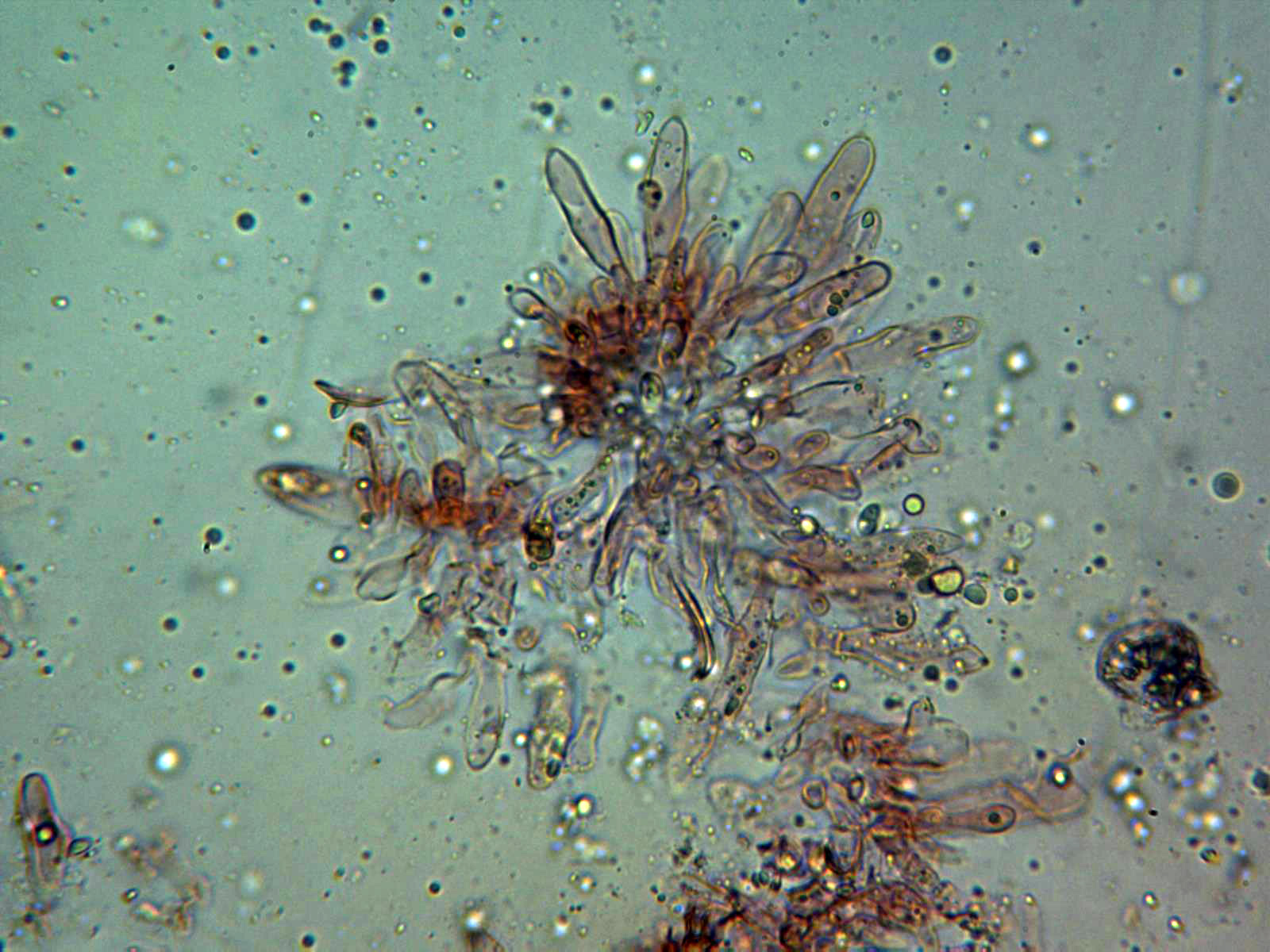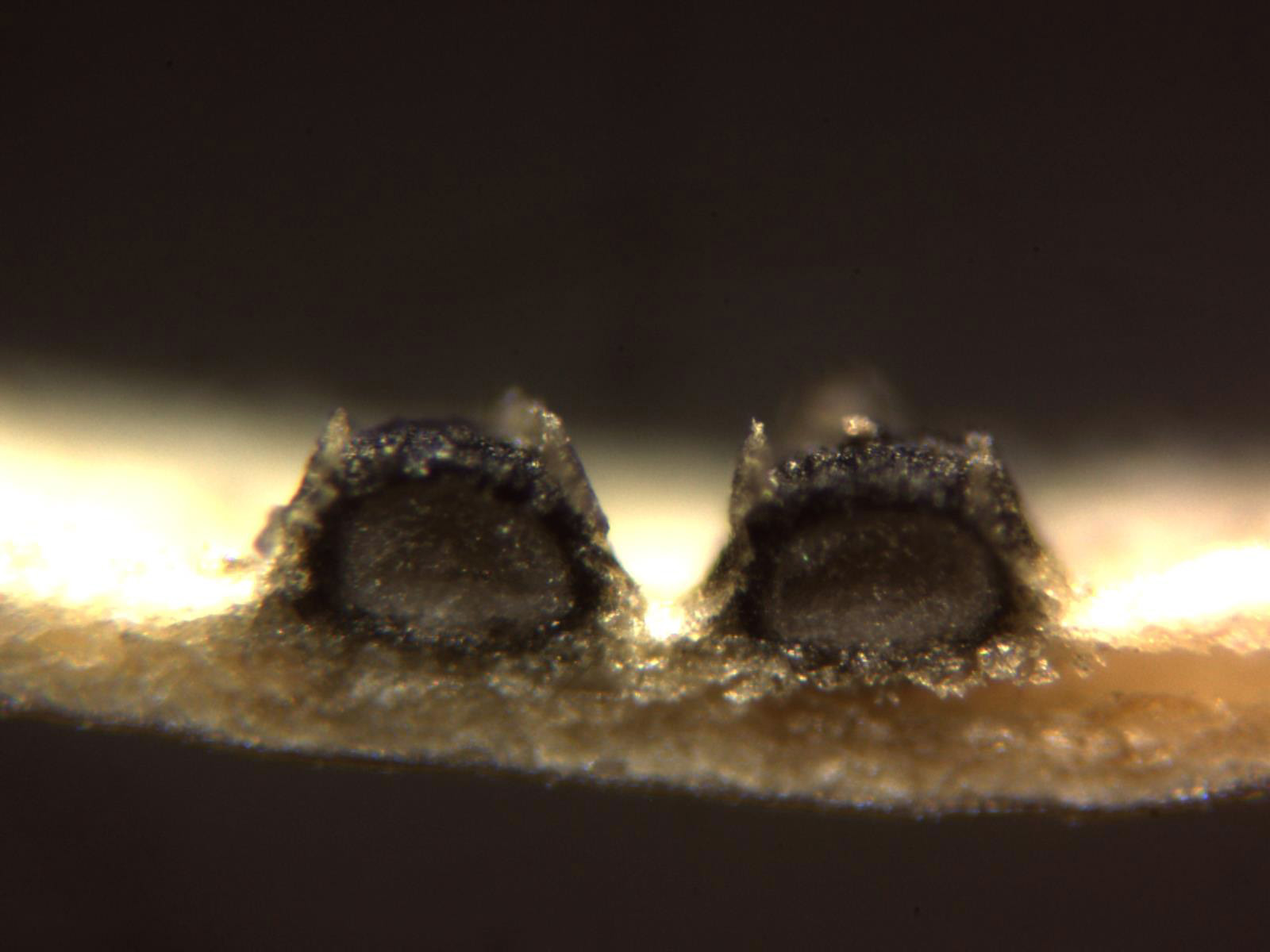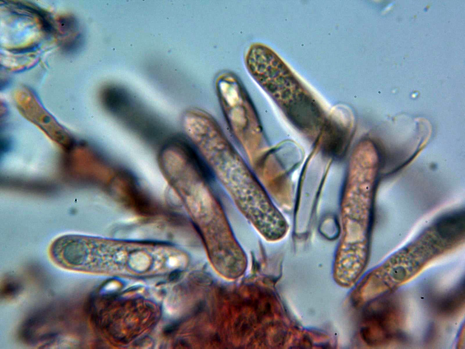 Muy pequeñas fructificaciones con forma globosa, de color marrón oscuro, gregarias, de entre 0,2 a 0,25 mm. de diámetro, con ostiolo central de ruptura irregular y una masa mucosa blanca en su interior donde se alojan los conidios. Conidióforos que recubren toda la capa interna, cilíndricos, no ramificados, hialinos y con pocos engrosamientos. Conidios cilíndricos, alargados, algunos algo curvados, de pared fina y contenido granuloso en su interior, y con unas medidas de: