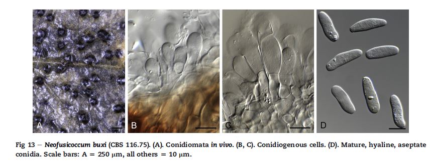 Tanto la Dothiorella candollei como la Sphaeria buxi se consideran los anamorfos de la Hyponectria buxi