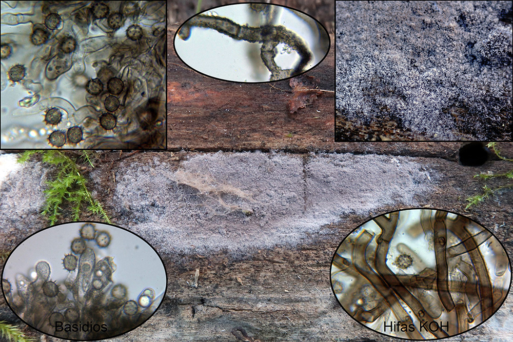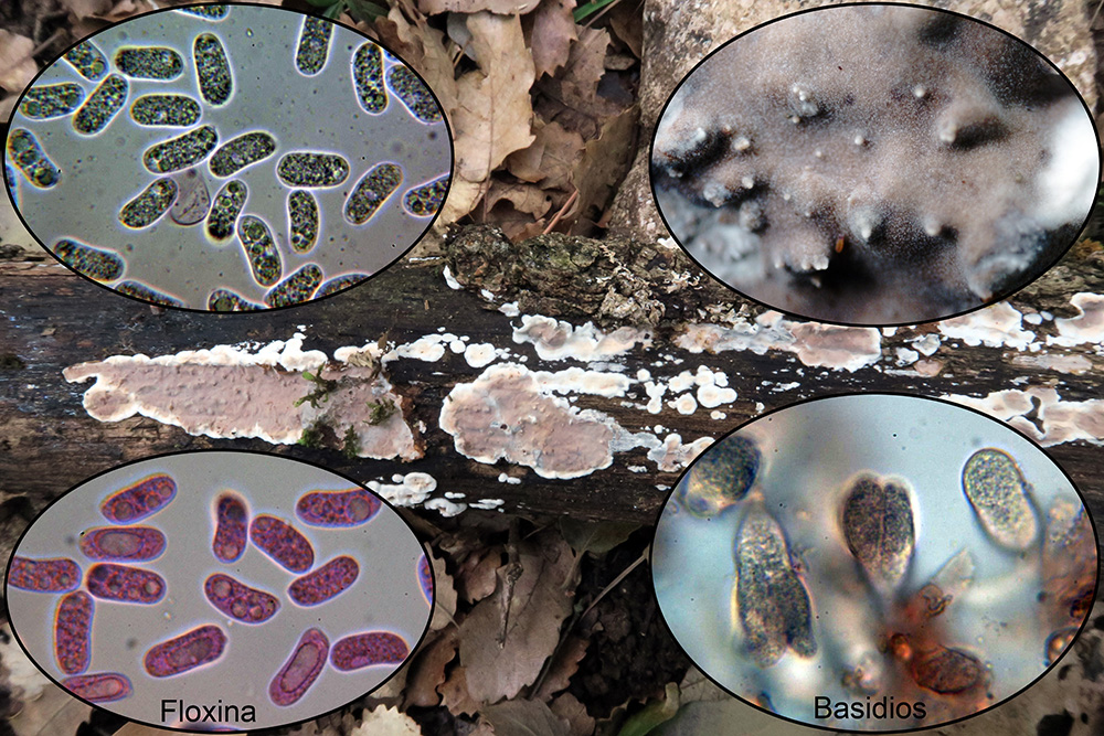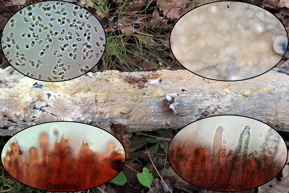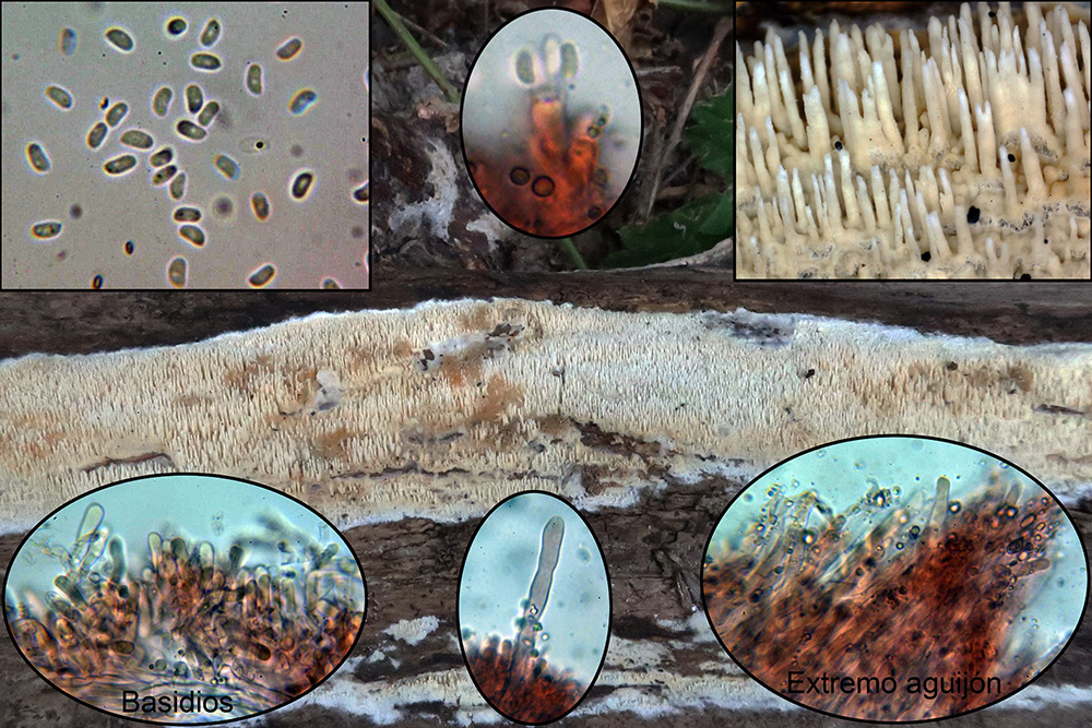 Una roña hidnoide sobre tronco con pequeñas esporas, la Mycoacia uda