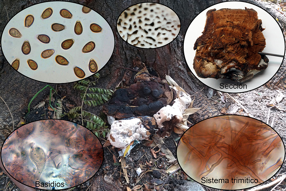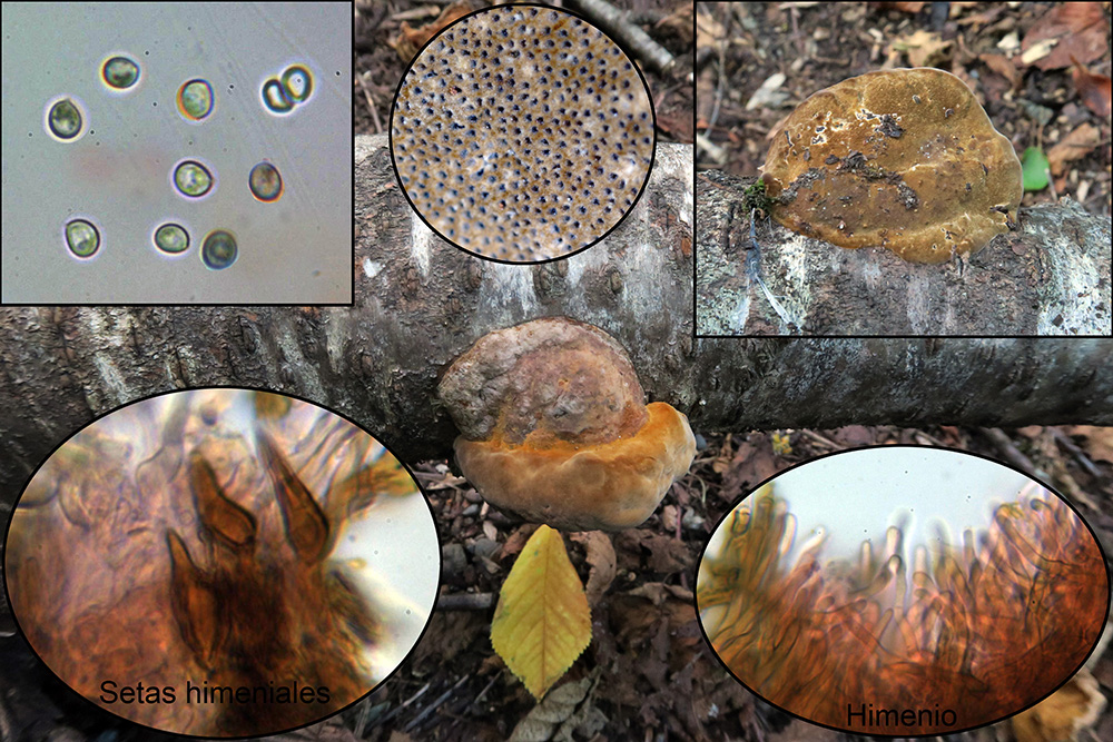 Un Phellinus que hasta la fecha no había podido contrastar con el micro con unas setas himeniales de (13.3) 14.5 - 16.9 (18.5) × 4.7 - 6 (6.1) µm, las claves de Ryvarden me llevan al Phellinus igniarius