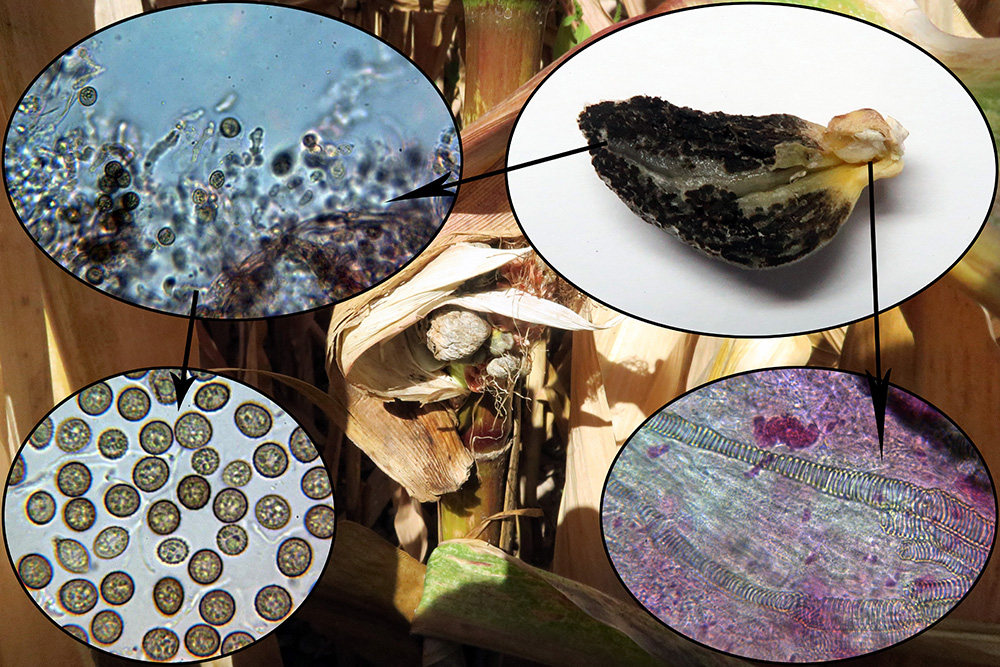 Y una que había estudiado ya un par de año atrás, esta vez he tenido la suerte de encontrarla en estado jóven, sobre las mazorcas de maíz, el "tizón del maíz", la Ustilago maydis