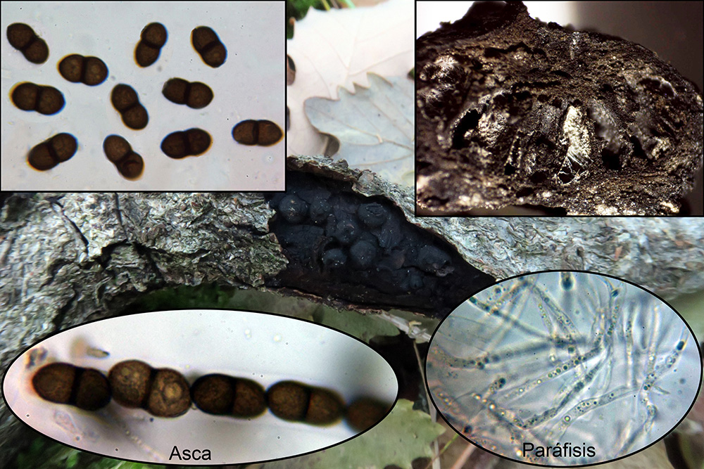 Una Valsaria sobre un pequeño tronco de roble, las claves de W. M. Jaklitsch y Jackes Fournier sobre este sustrato citan la Valsaria rudis, con la cuál coincide plenamente.