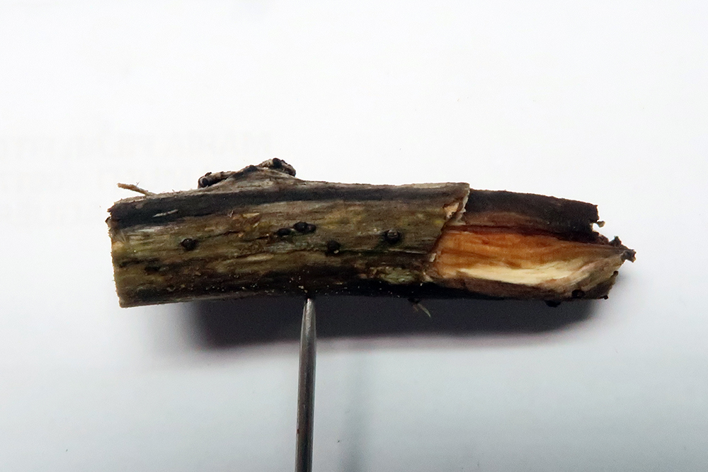 Un hongo encontrado de propina sobre un pequeño tronco de Crataegus monogyna, que me había llevado para su estudio recogido el 29 de Septiembre, donde compartía espacio con varios ascomicetos más.