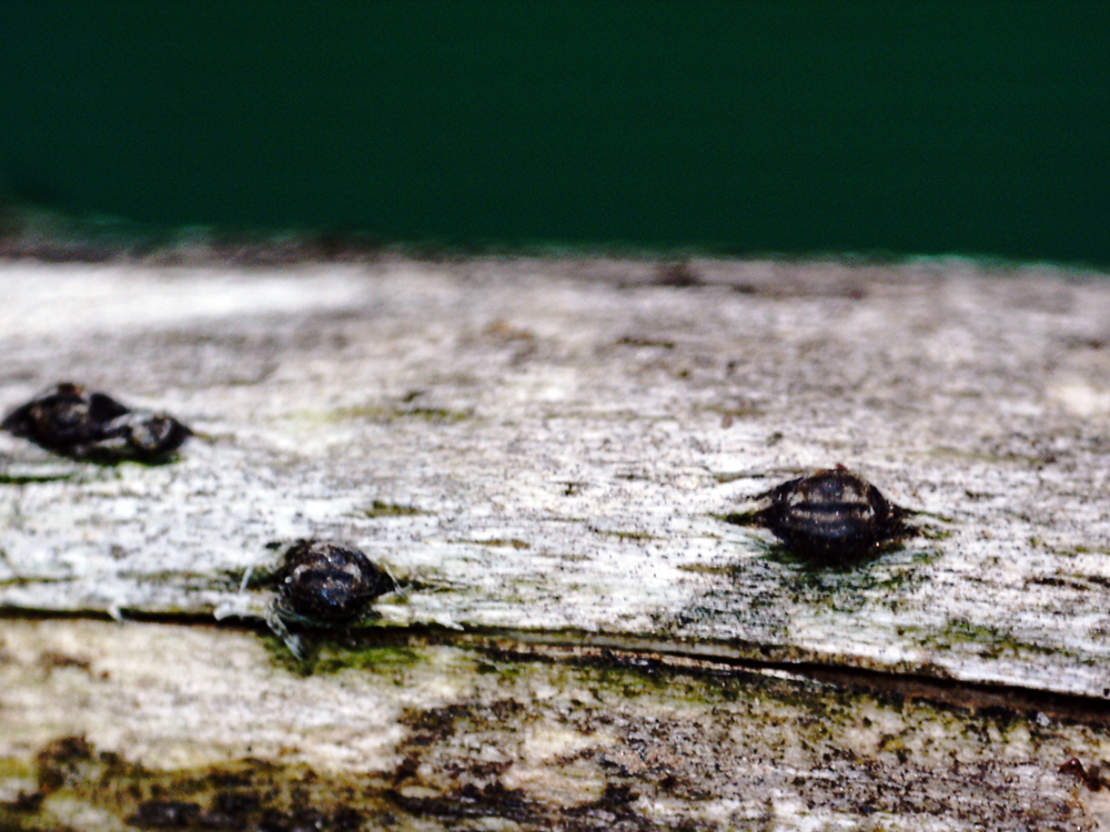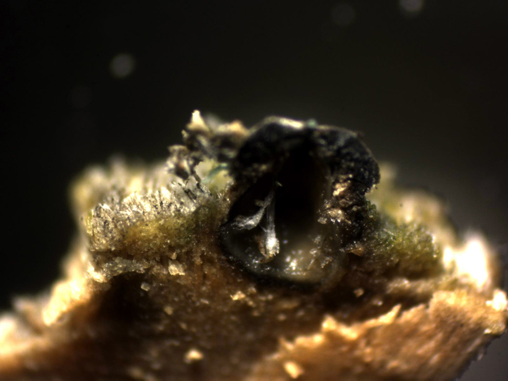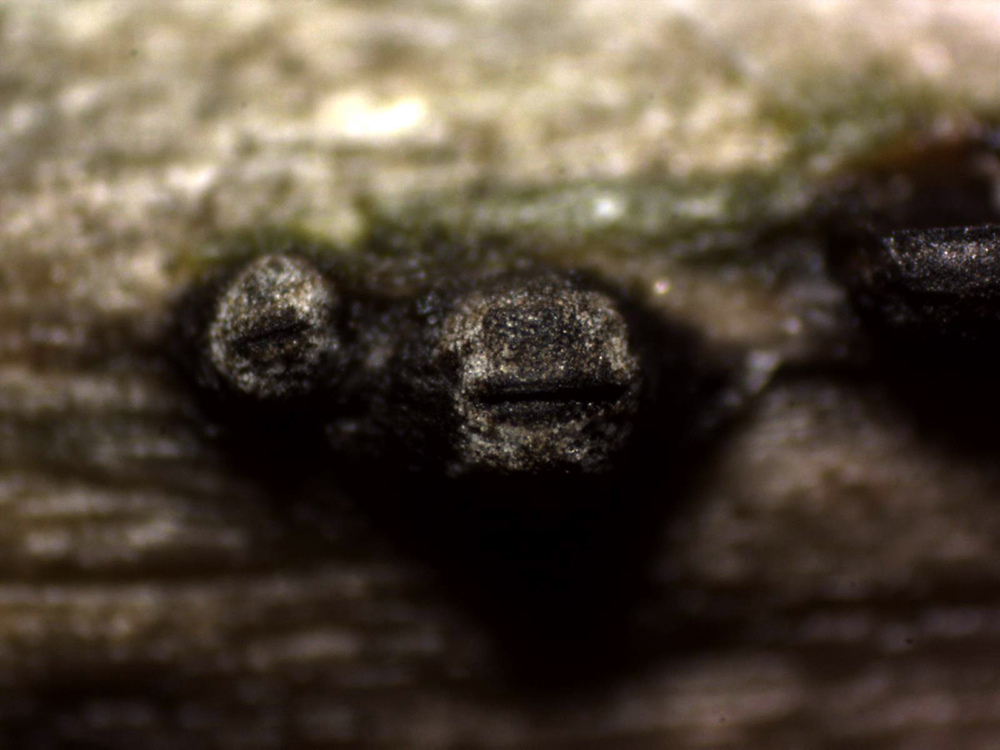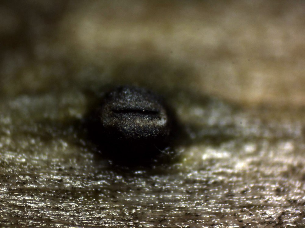 Muy dimitutas fructificaciones a modo de granos de color negruzco con una hendidura en su superficie , los de este estudio de entre 0,51 y 0,78 mm.