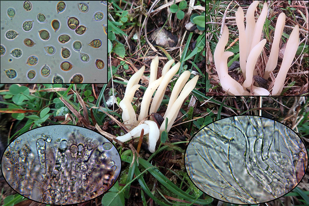 Seguimos con una Clavaria, que a pié de campo pensamos en Clavaria fragilis, despista un poco el no apreciar en la imágen un pié estéril en la base diferenciado, pero este pié era bien visible en los 5 ejemplares que utilicé para la esporulación, y cuando sacamos la imágen estaba hundido en el sustrato, se trata de Clavaria acuta, y como diferencias mas notables con la Clavaria fragilis están las fíbulas en la base de sus basidios (ausentes en C. fragilis) y sus medidas esporales muy por encima (C. fragilis con esporas de 4,5;6 X 3;3,8 µm;).