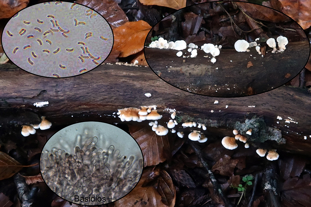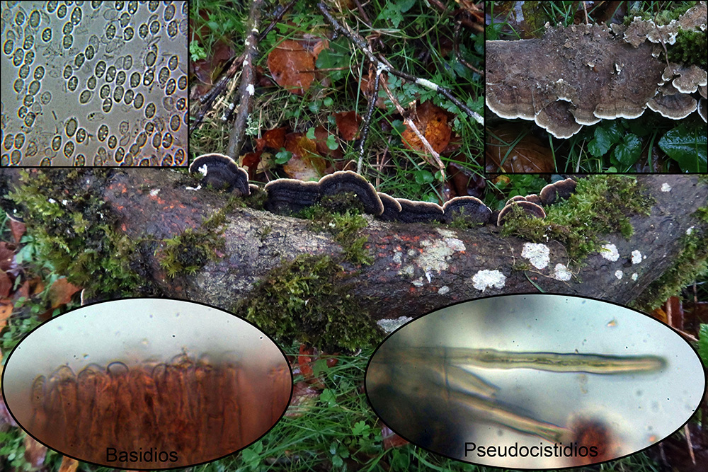 Nos encontramos asimismo con la Lopharia spadicea, actualmente Porostereum spadiceum, con sus peculiares pseudocistidios.