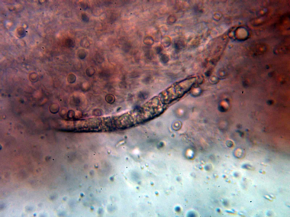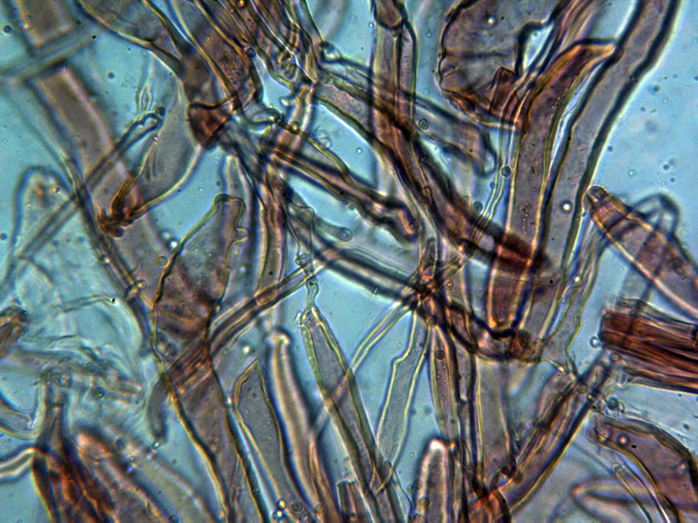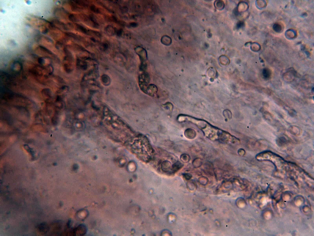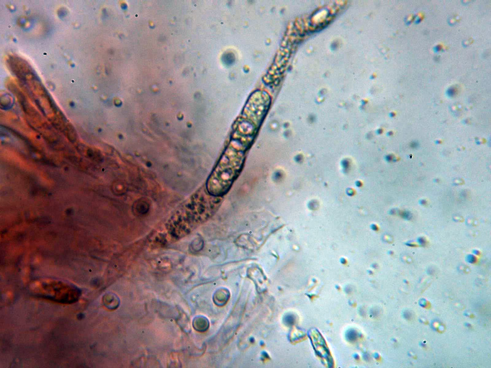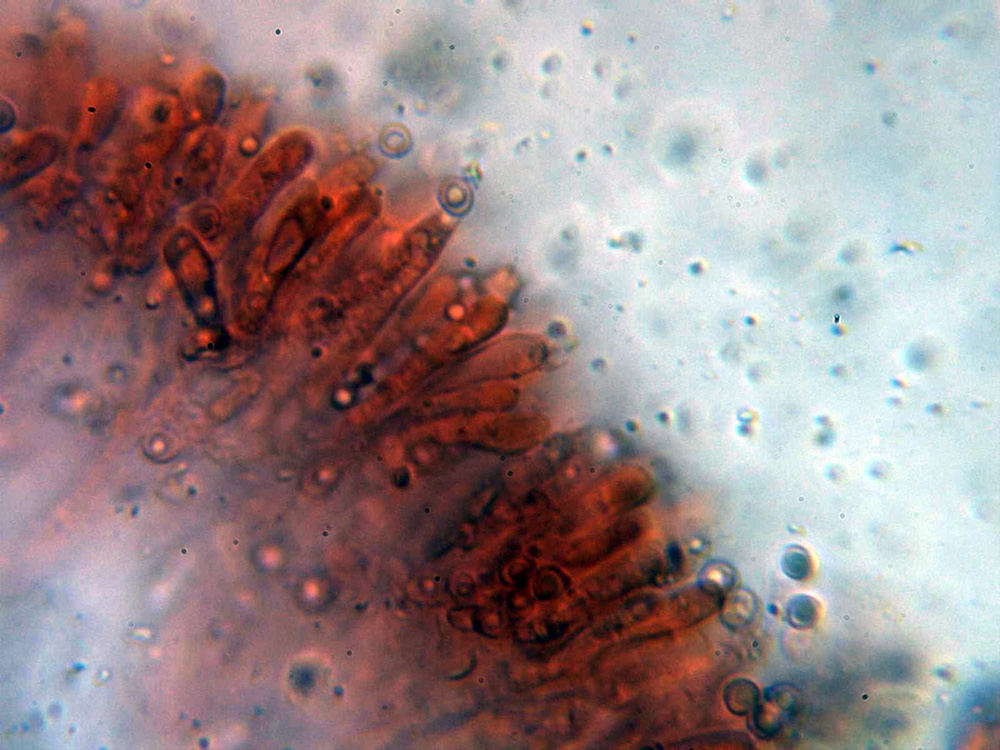 Himenio a 400 aumentos, con abundantes hifas con contenido que se proyectan hacia el fondo del himenio a modo de cistidios.