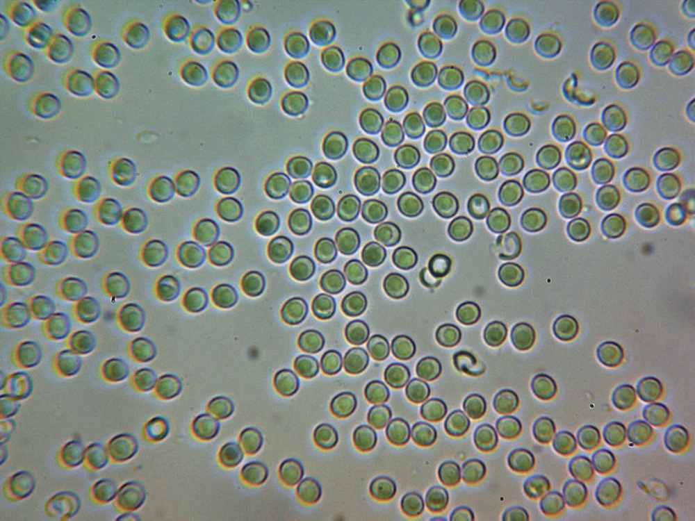 Esporas globosas, de pared gruesa, con una gran gota en su interior, las de la imágen en agua destilada.