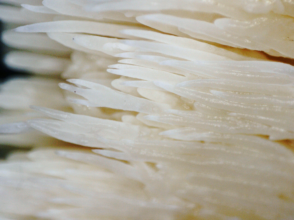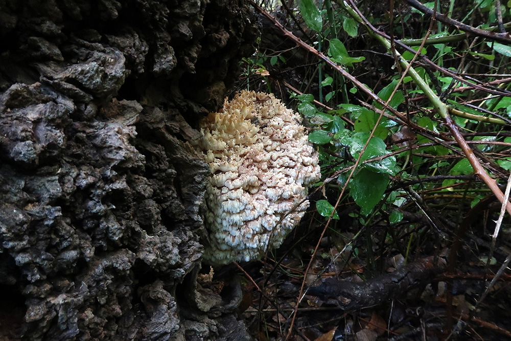 Cuerpo fructífero de gran tamaño (mas de 20 cm.), que se podía ver a distancia, de color blanco crema, con ramificaciones partiendo de un tronco común, con ramas dispuestas en hileras de las que cuelgan las espinas de color blanco, estas espinas generalmente no sobrepasan el cm. de longitud, actuando de manera saprófita sobre un tronco muerto en el que años atrás había visto brotar de manera masiva el Pleurotus ostreatus, aunque no creo que guarde ninguna relación con él.