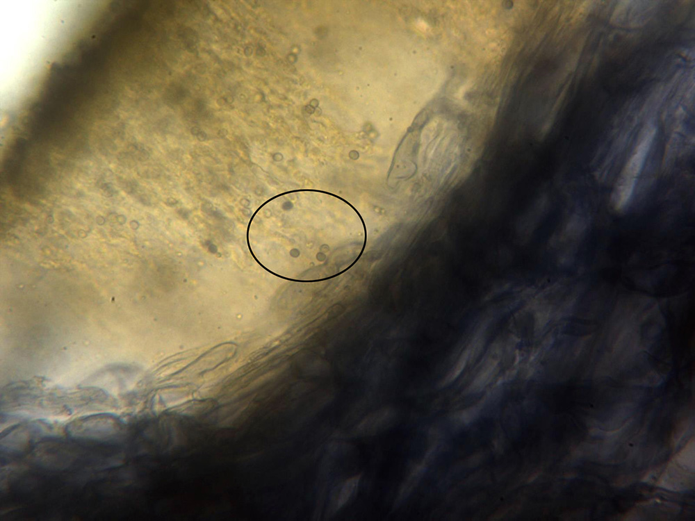 Sección del himenio con una trama fuertemente amiloide y también pero ya en menor medida las esporas asimismo amiloides (en el círculo)