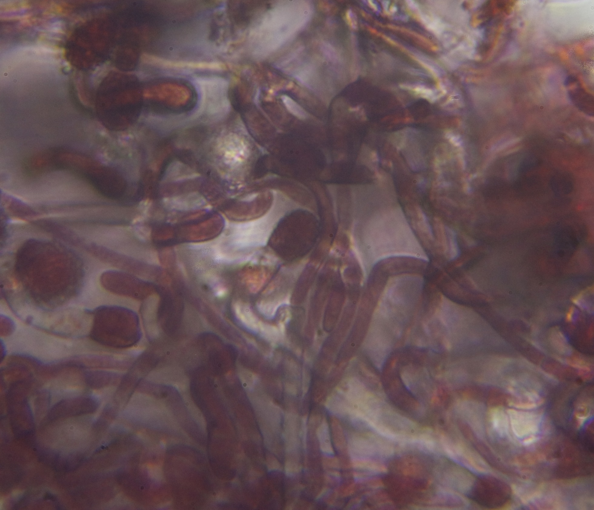 Hola Jon Ander con toda probabilidad se trata de Hypomyces cervinus, un parásito de las Helvellas, te dejo unas imágenes mías de la especie. Un poco raro que no encontraras además conidios.