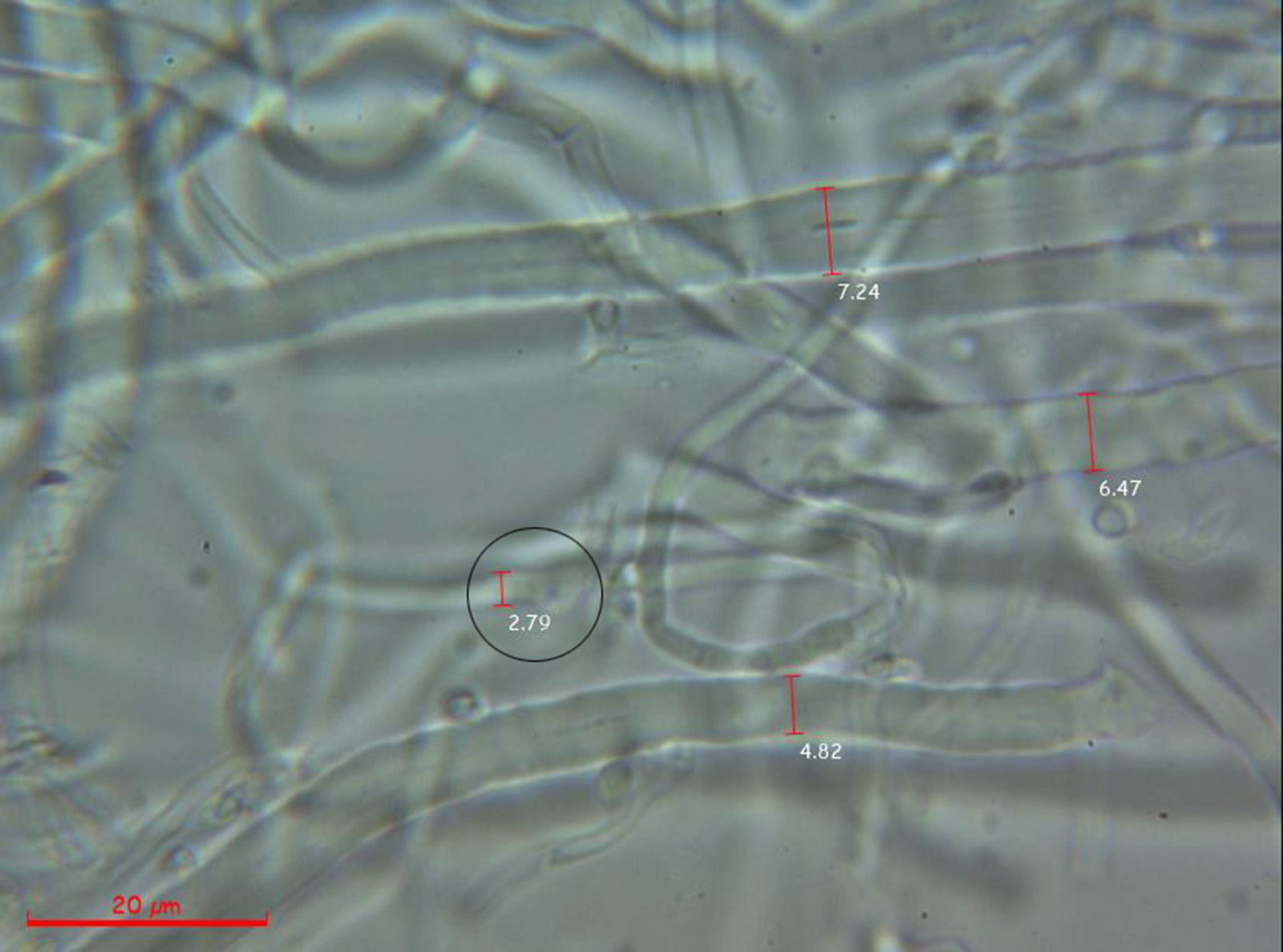 La anchura de las hifas esqueléticas de entre 4,82 a 7,24 µm., bastante acordes con las medidas citadas por Ryvarden (3 a 7 µm.), en el círculo la anchura de una hifa generativa, dentro del mismo círculo se puede apreciar también una fíbula, las hifas generativas son hialinas.