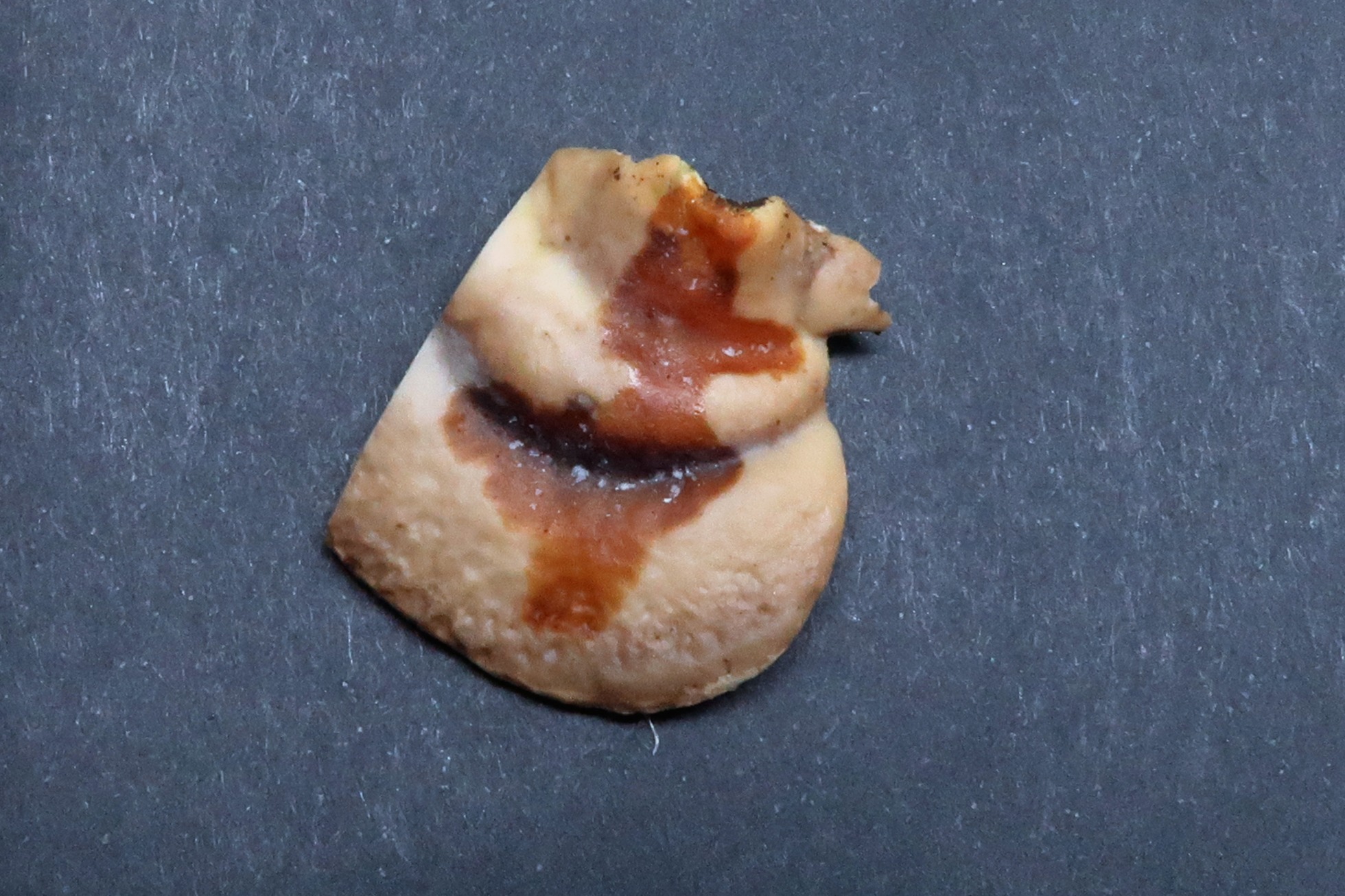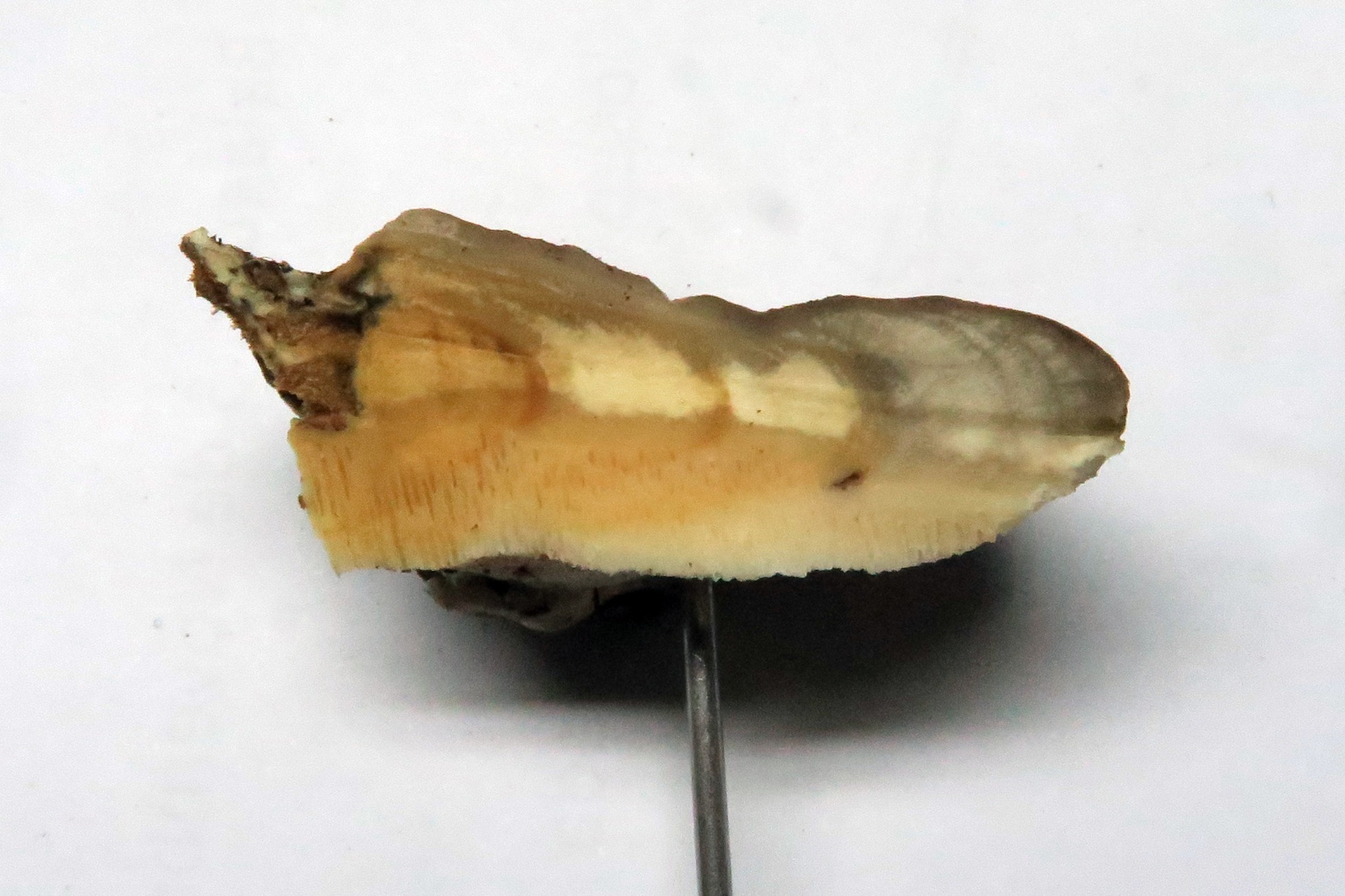 Carne de color crema pálido, con bandas de crecimiento concéntricas separadas por una línea grisácea.