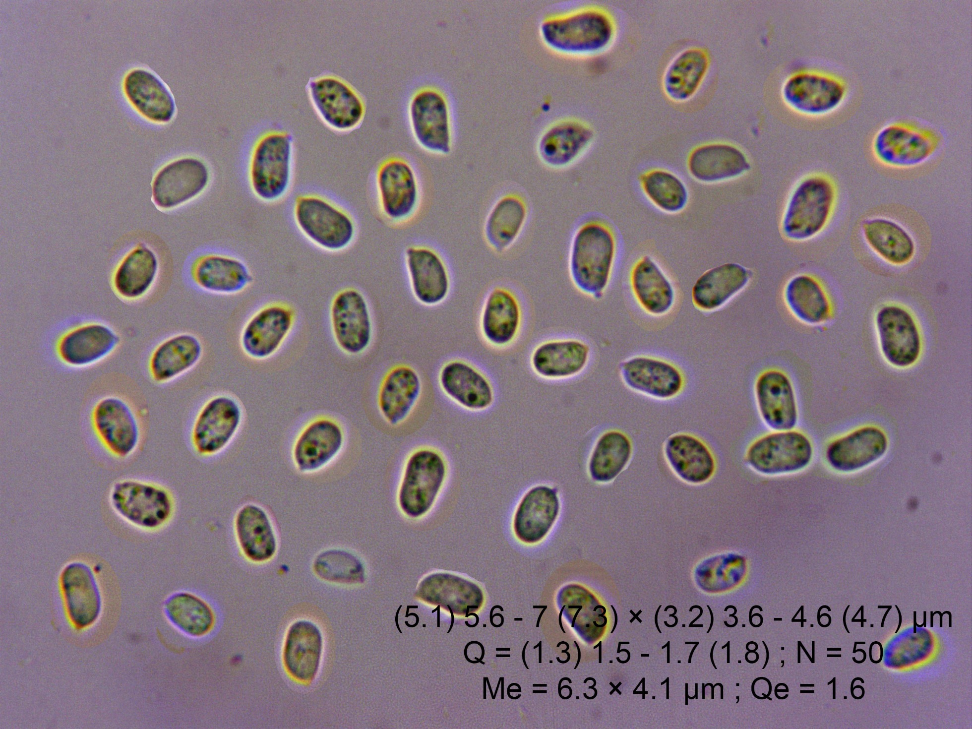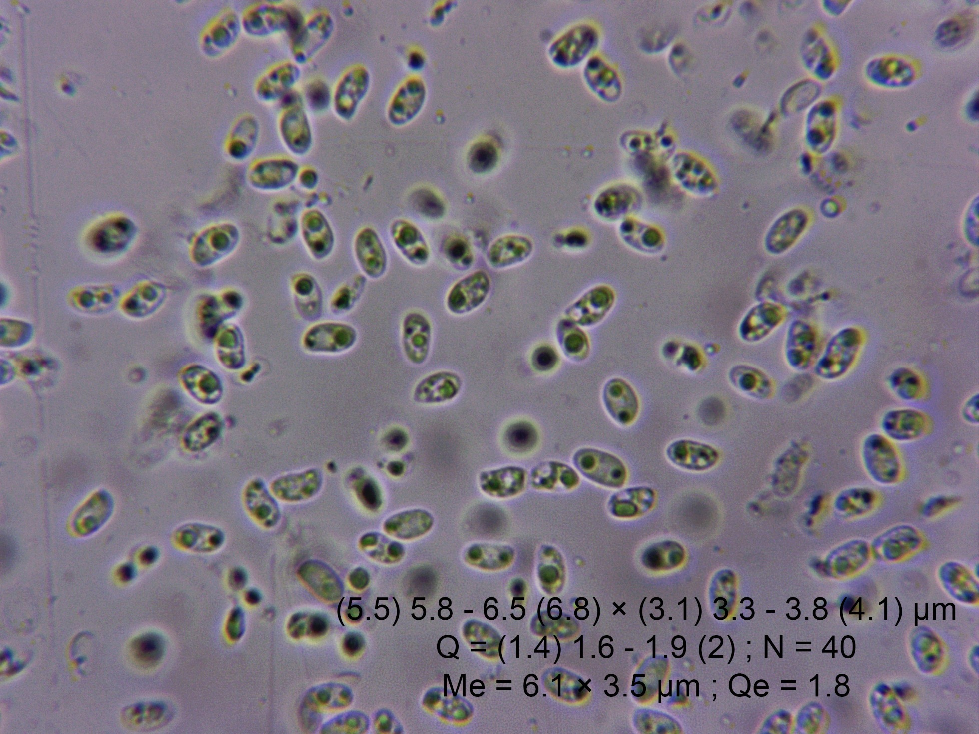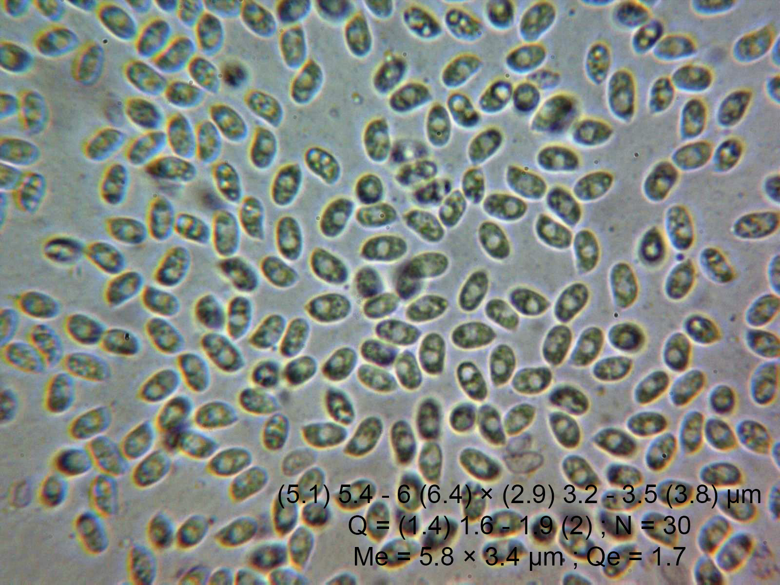 Conclusión: Se puede observar unas notables diferencias entre las medidas esporales de las muestras en función de si brotaban sobre pino o sobre planifolio, las dos mediciones realizadas sobre madera de planifolio parecen concordar perfectamente. Según Ryvarden una de las características del Trametes ljubarskyi clave para su identificación sería la anchura esporal de hasta 4 µm., en mi estudio realizado a la muestra sobre pino, si bien entraban dentro del rango en cuanto a su longitud, mayoritariamente excedían de esta medida en anchura, con una media de 4,1 µm., el cociente Q asimismo difería bastante Qe = 1,6 para la muestra de pino y Qe = 1,7 - 1,8 para la muestra recogida en soto fluvial.