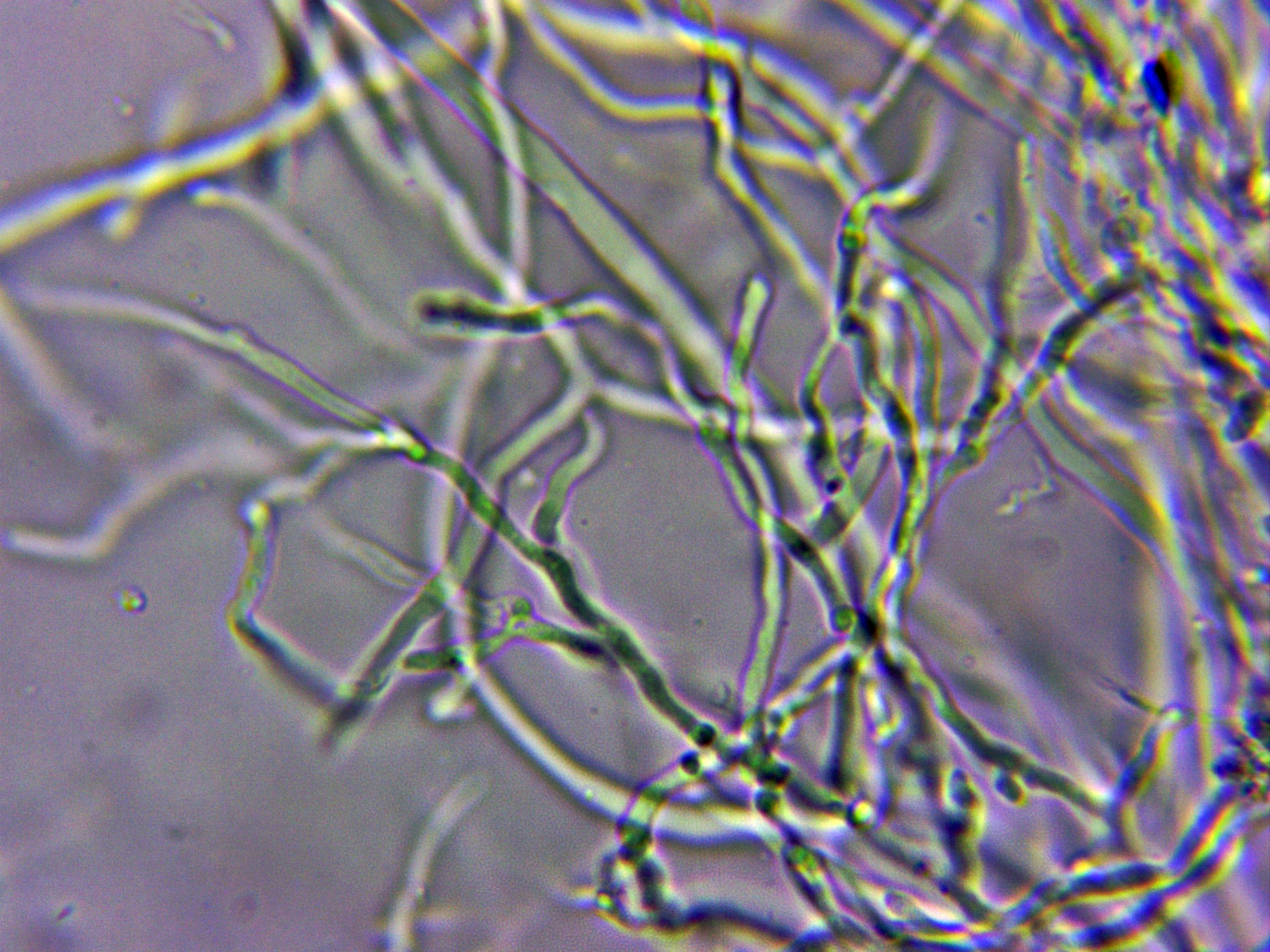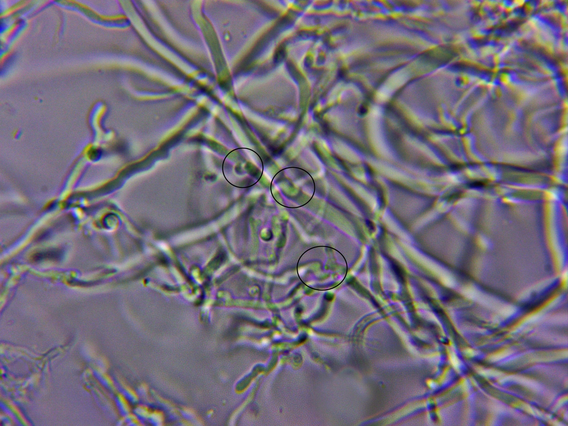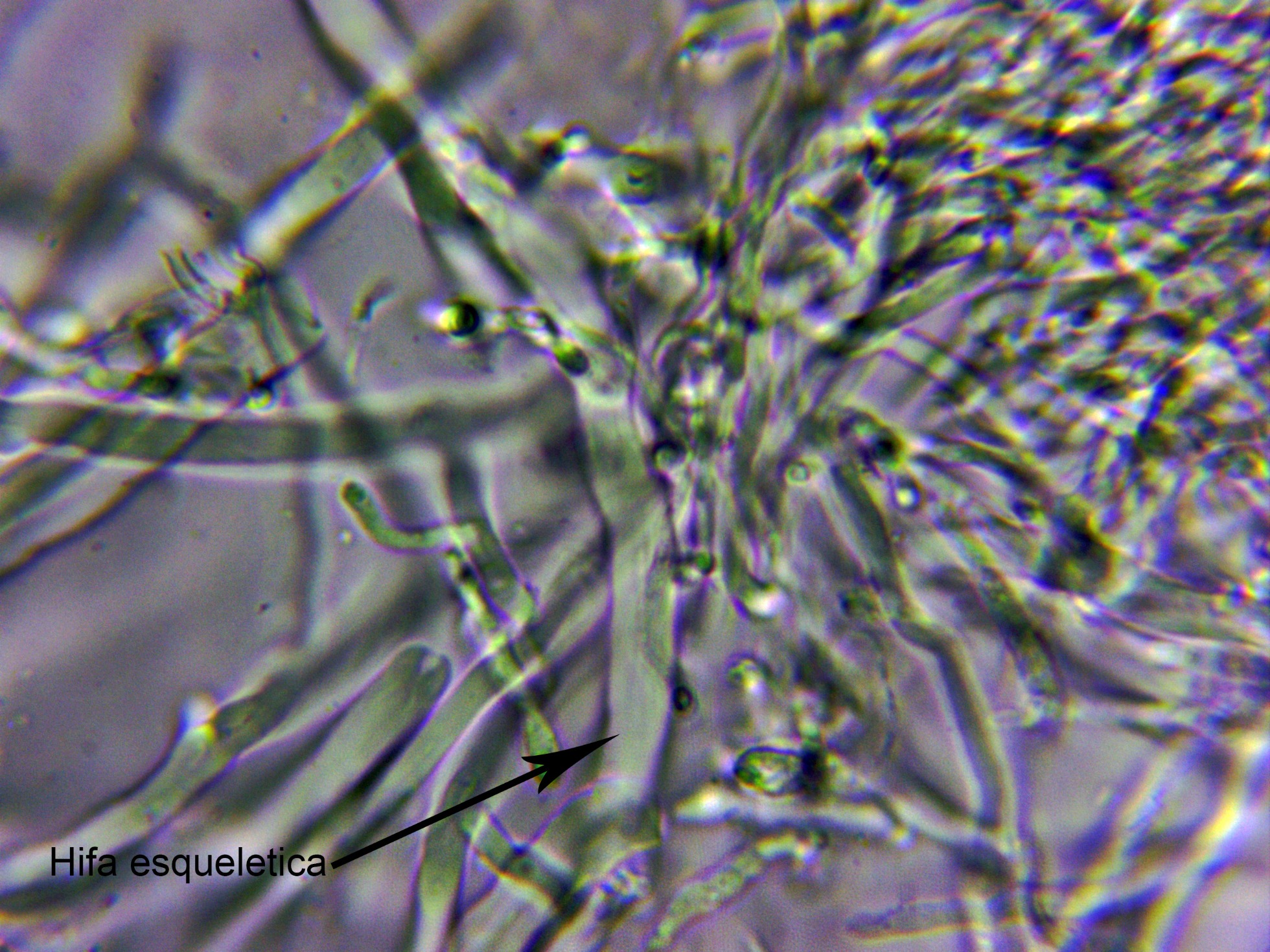 En la imágen puede apreciarse un hifa esqueletica sin septos ni fíbulas mucho mas gruesa que el resto.